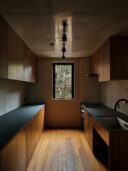 干田正浩 / MHAAによる、東京・目黒区の集合住宅「盤桓」。樹木が茂り“心地よい風”が流れる旧家の敷地での計画。木々を残し“風を取込む”建築を求め、内部から考えて“多様な住戸タイプ”を立体的に組合せる構成を考案。緑との補色関係を考慮して朱色のファサードとする1階、住戸B、キッチン(建築家による解説:サザンカの見えるキッチン) photo©藤井浩司 TOREAL