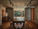 干田正浩 / MHAAによる、東京・目黒区の集合住宅「盤桓」。樹木が茂り“心地よい風”が流れる旧家の敷地での計画。木々を残し“風を取込む”建築を求め、内部から考えて“多様な住戸タイプ”を立体的に組合せる構成を考案。緑との補色関係を考慮して朱色のファサードとする2階、住戸G、ダイニング photo©藤井浩司 TOREAL