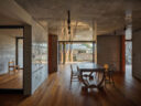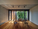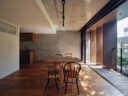 干田正浩 / MHAAによる、東京・目黒区の集合住宅「盤桓」。樹木が茂り“心地よい風”が流れる旧家の敷地での計画。木々を残し“風を取込む”建築を求め、内部から考えて“多様な住戸タイプ”を立体的に組合せる構成を考案。緑との補色関係を考慮して朱色のファサードとする1階、住戸A、ダイニングからリビング側を見る。(建築家による解説:八重桜を望めるダイニングキッチン) photo©藤井浩司 TOREAL