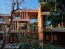 干田正浩 / MHAAによる、東京・目黒区の集合住宅「盤桓」。樹木が茂り“心地よい風”が流れる旧家の敷地での計画。木々を残し“風を取込む”建築を求め、内部から考えて“多様な住戸タイプ”を立体的に組合せる構成を考案。緑との補色関係を考慮して朱色のファサードとする開放樋ディテール image©MHAA建築設計事務所