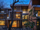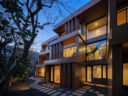 干田正浩 / MHAAによる、東京・目黒区の集合住宅「盤桓」。樹木が茂り“心地よい風”が流れる旧家の敷地での計画。木々を残し“風を取込む”建築を求め、内部から考えて“多様な住戸タイプ”を立体的に組合せる構成を考案。緑との補色関係を考慮して朱色のファサードとする外観、敷地内の南東側から見る。夜景 photo©藤井浩司 TOREAL