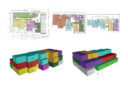 共用部を最小限とした結果、1–2階メゾネット、2–3階メゾネット、単層住戸が混在し、全住戸が異なる独立したプラン構成となった。