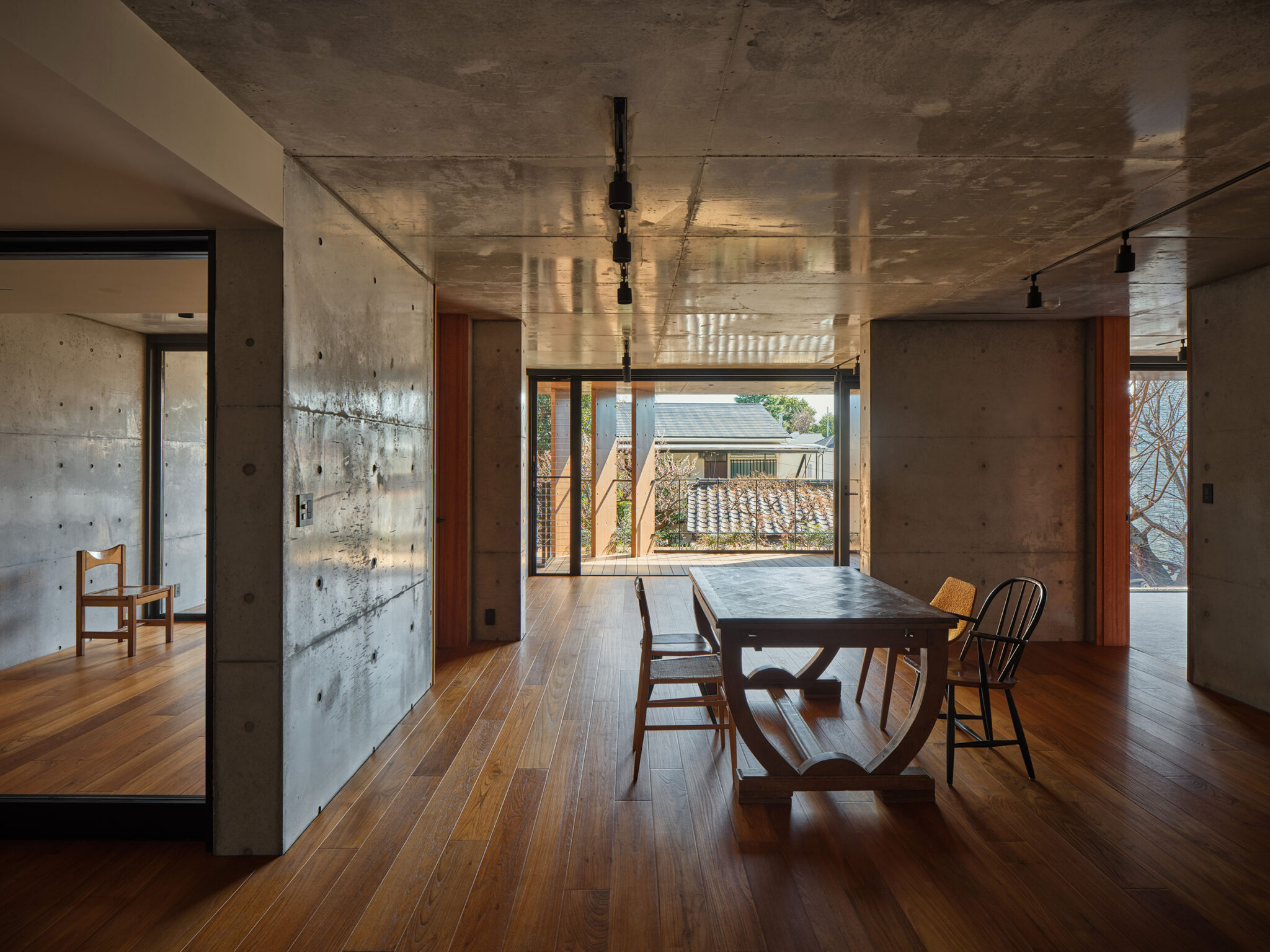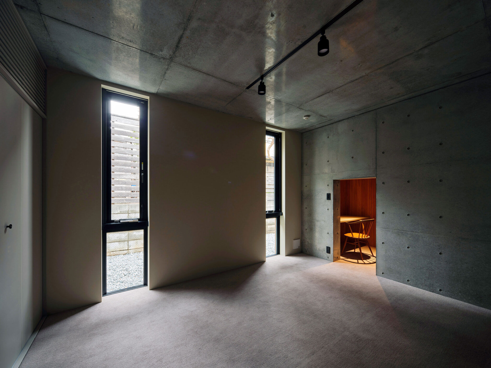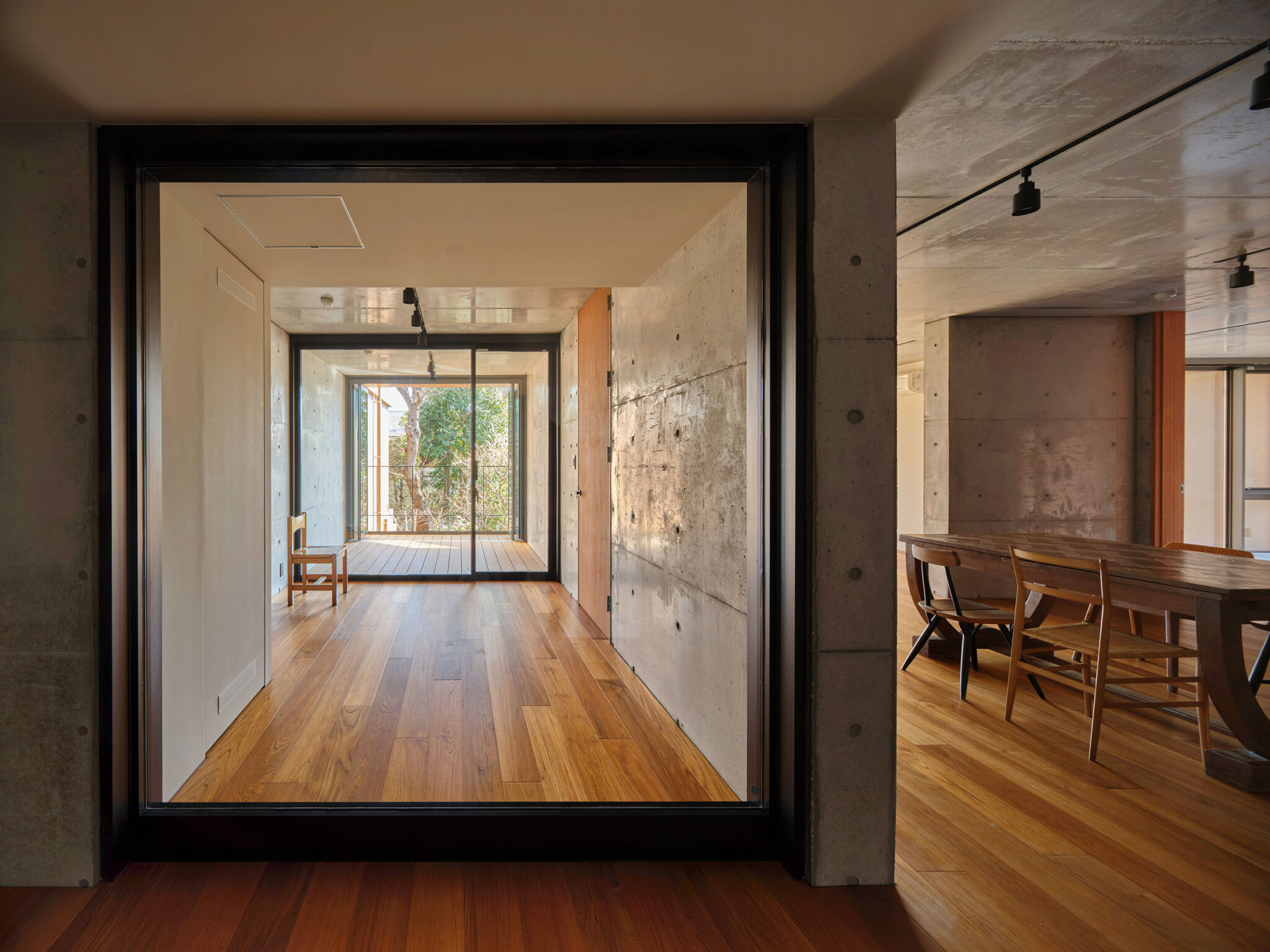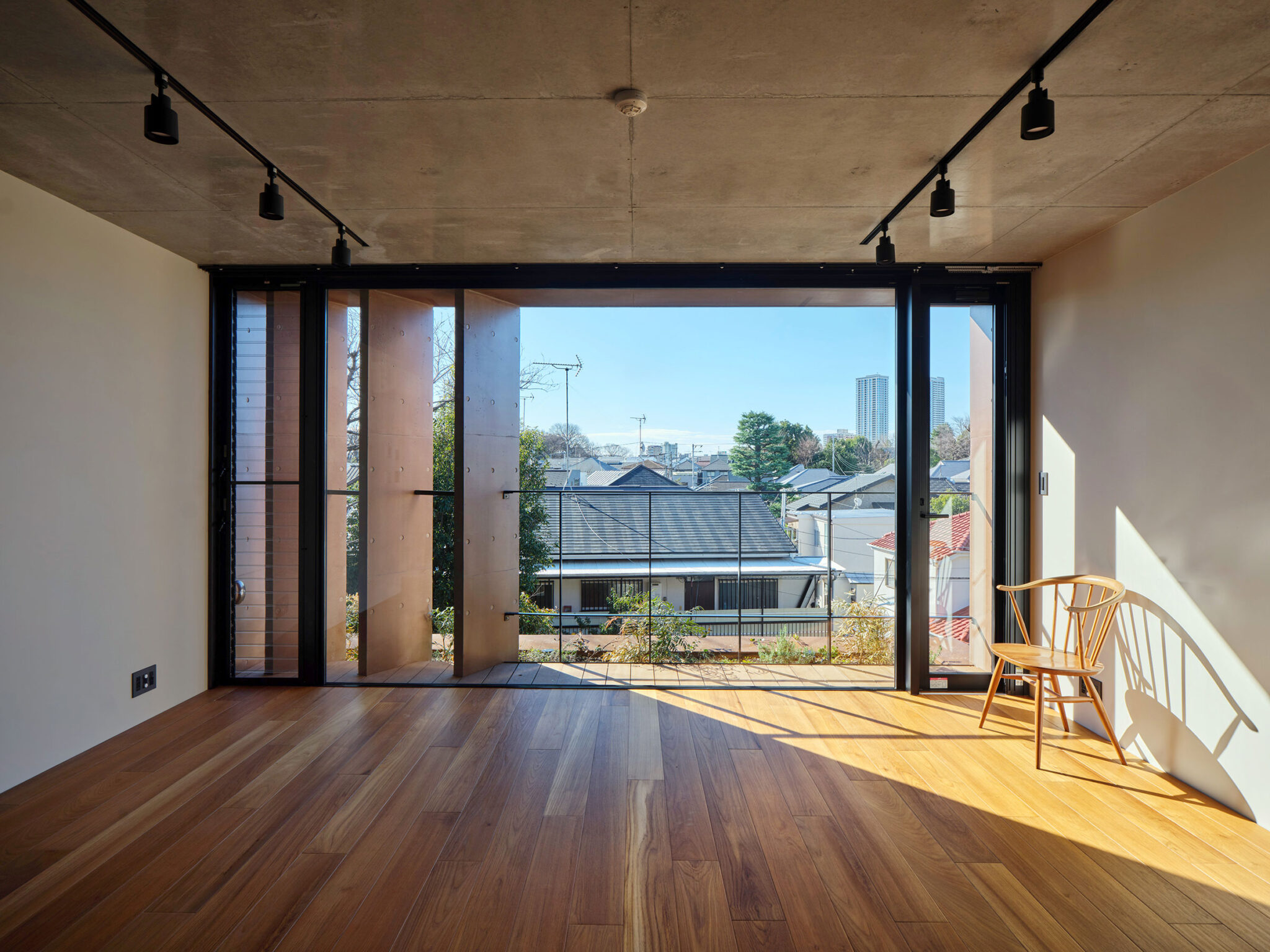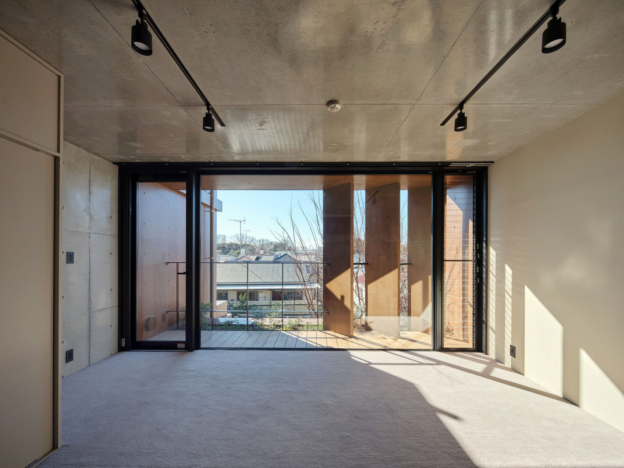 構造は経済性と遮音性を考慮し、逆梁の壁式構造を採用。逆梁とすることで天井仕上げを省略でき、室内にはフラットで伸びやかな天井面が生まれる。建具は高さ2550mmのフルハイトとし、外部の風景と連続する大らかなスケール感をつくり出している。