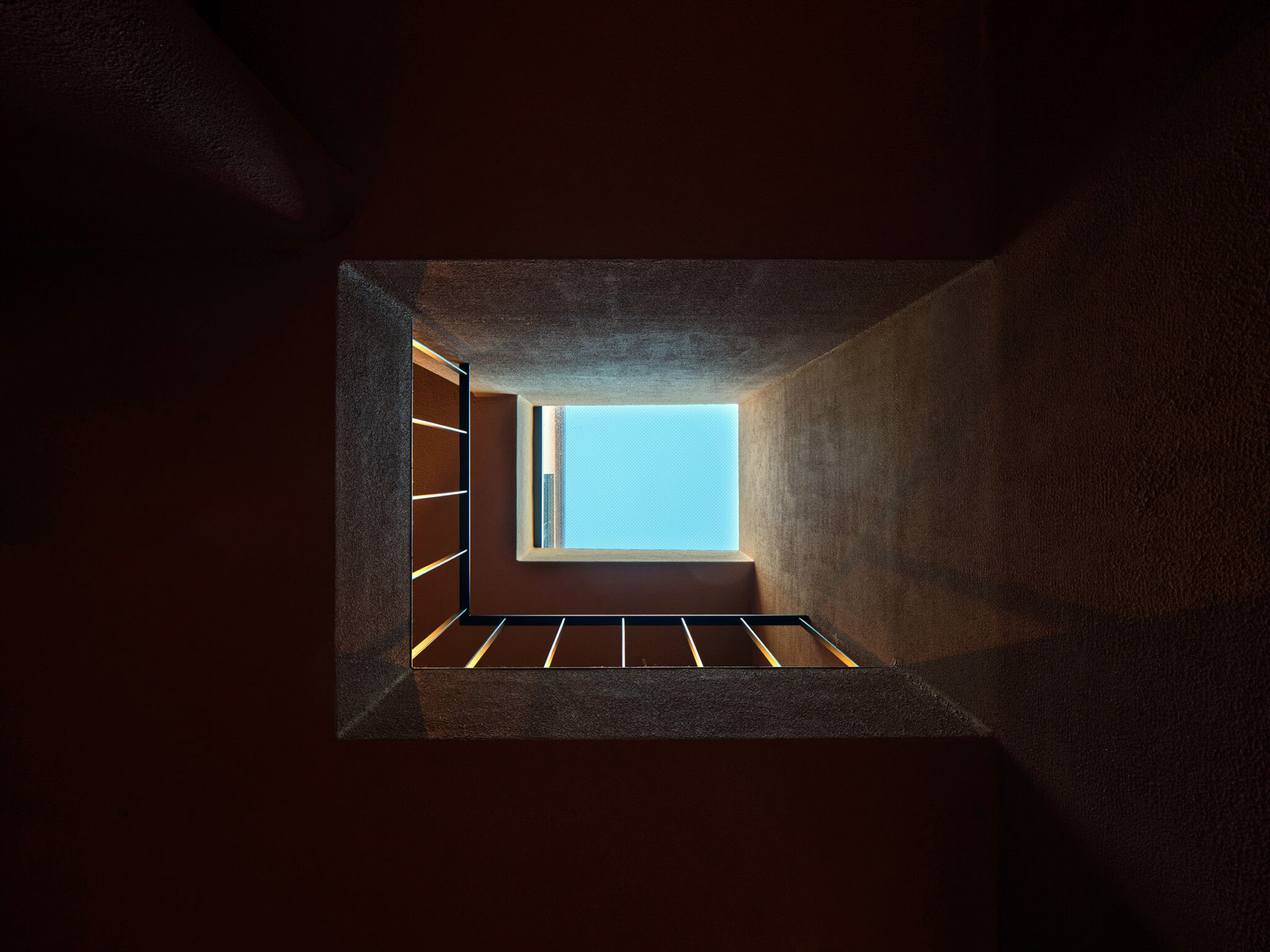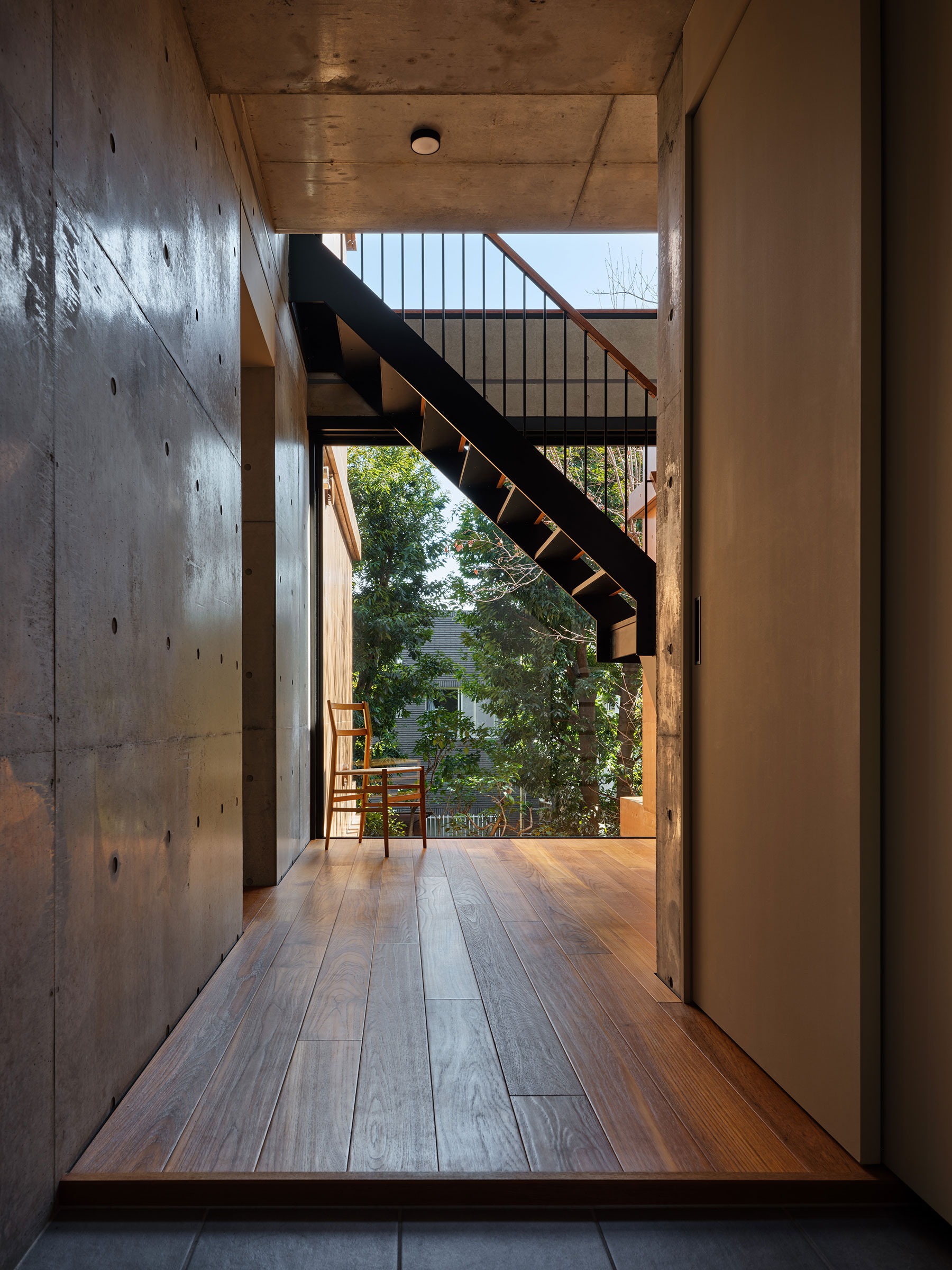 干田正浩 / MHAAによる、東京・目黒区の集合住宅「盤桓」。樹木が茂り“心地よい風”が流れる旧家の敷地での計画。木々を残し“風を取込む”建築を求め、内部から考えて“多様な住戸タイプ”を立体的に組合せる構成を考案。緑との補色関係を考慮して朱色のファサードとする3階、住戸G、2階から3階への階段 photo©藤井浩司 TOREAL