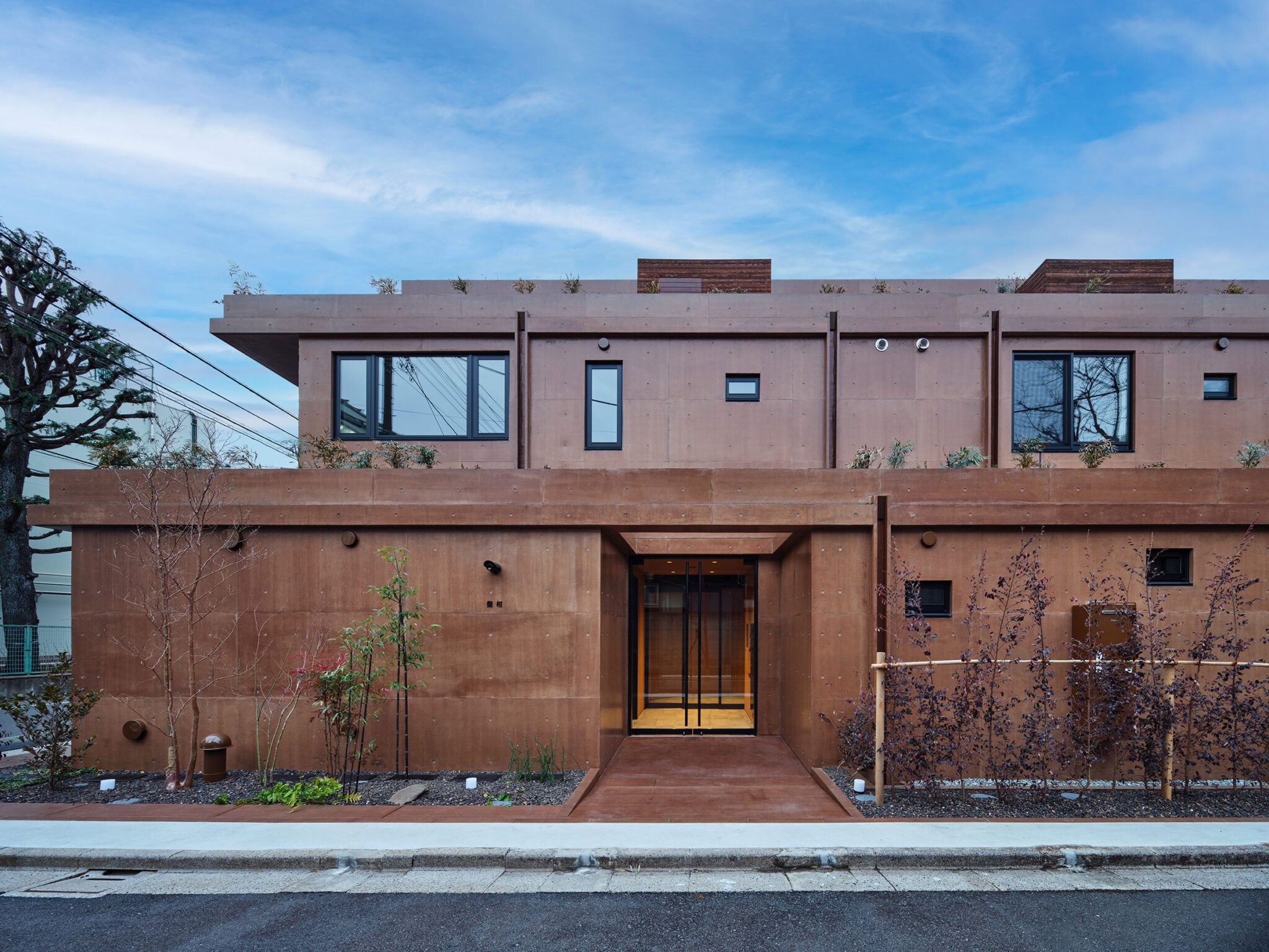 干田正浩 / MHAAによる、東京・目黒区の集合住宅「盤桓」。樹木が茂り“心地よい風”が流れる旧家の敷地での計画。木々を残し“風を取込む”建築を求め、内部から考えて“多様な住戸タイプ”を立体的に組合せる構成を考案。緑との補色関係を考慮して朱色のファサードとする外観、北側の道路から見る。(建築家による解説:通りからの視線を遮りながら、南からの光と風を取り入れる) photo©藤井浩司 TOREAL