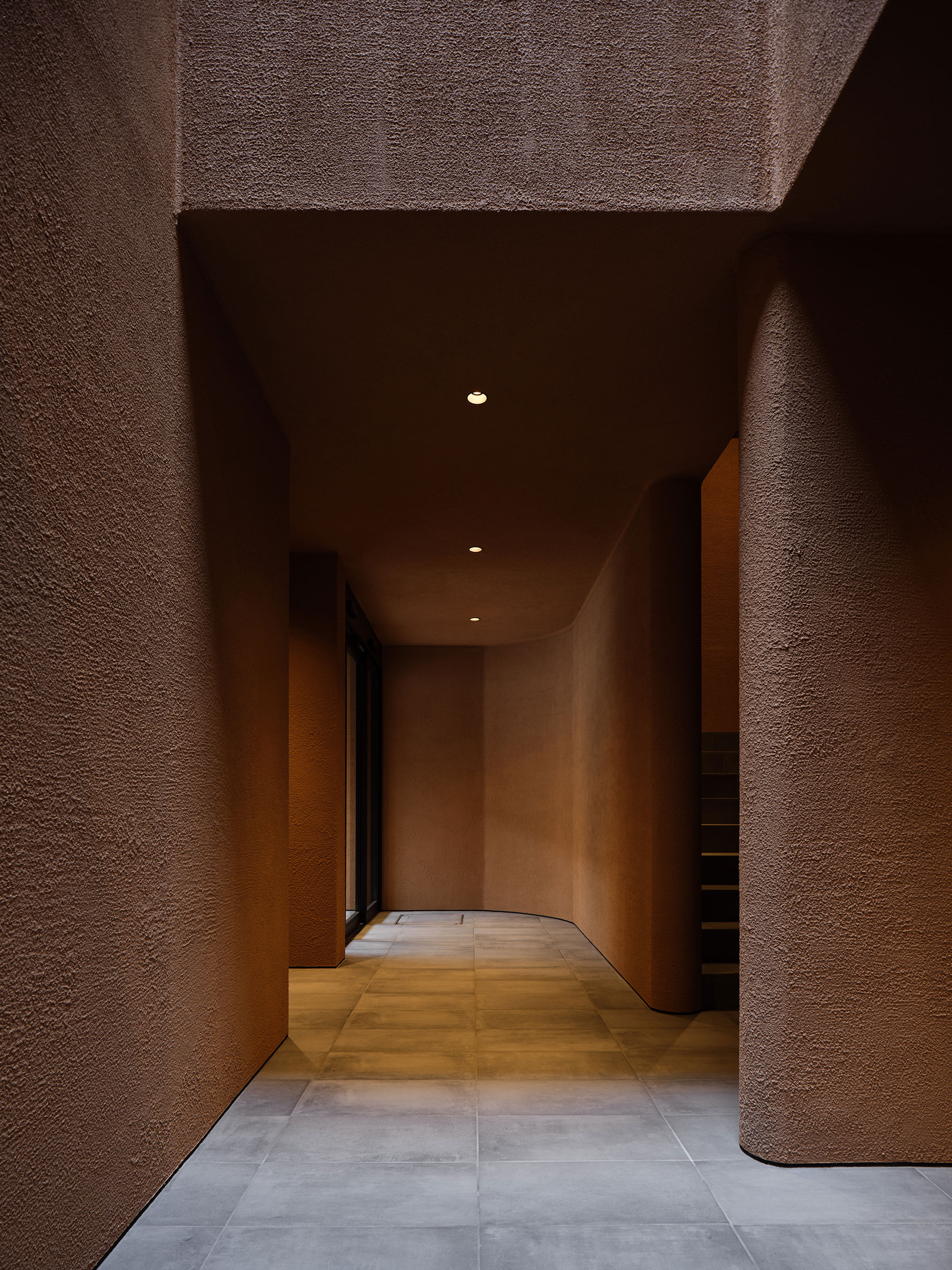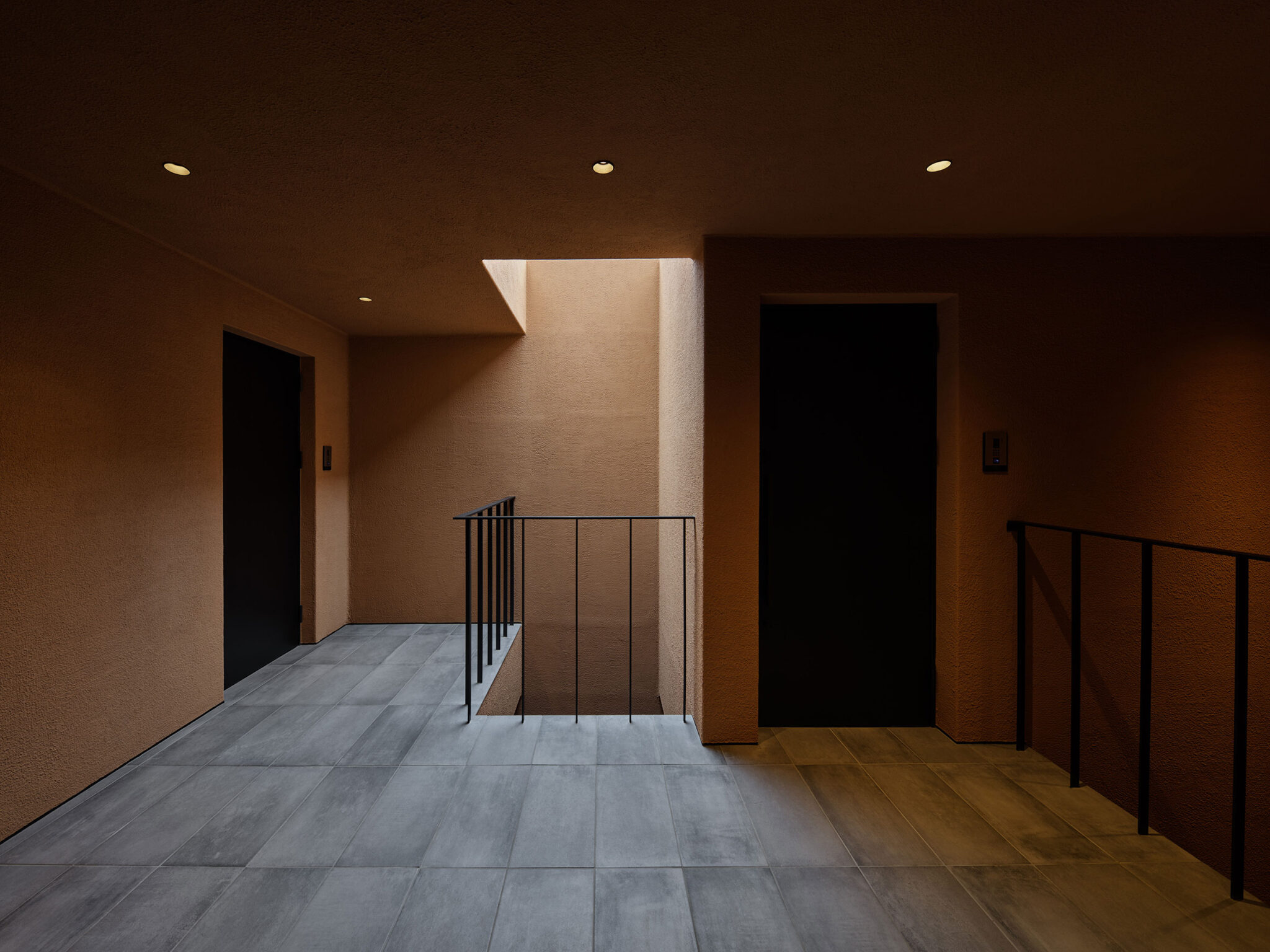 干田正浩 / MHAAによる、東京・目黒区の集合住宅「盤桓」。樹木が茂り“心地よい風”が流れる旧家の敷地での計画。木々を残し“風を取込む”建築を求め、内部から考えて“多様な住戸タイプ”を立体的に組合せる構成を考案。緑との補色関係を考慮して朱色のファサードとする2階、住戸G、エントランス側からホールを見る。 photo©藤井浩司 TOREAL
