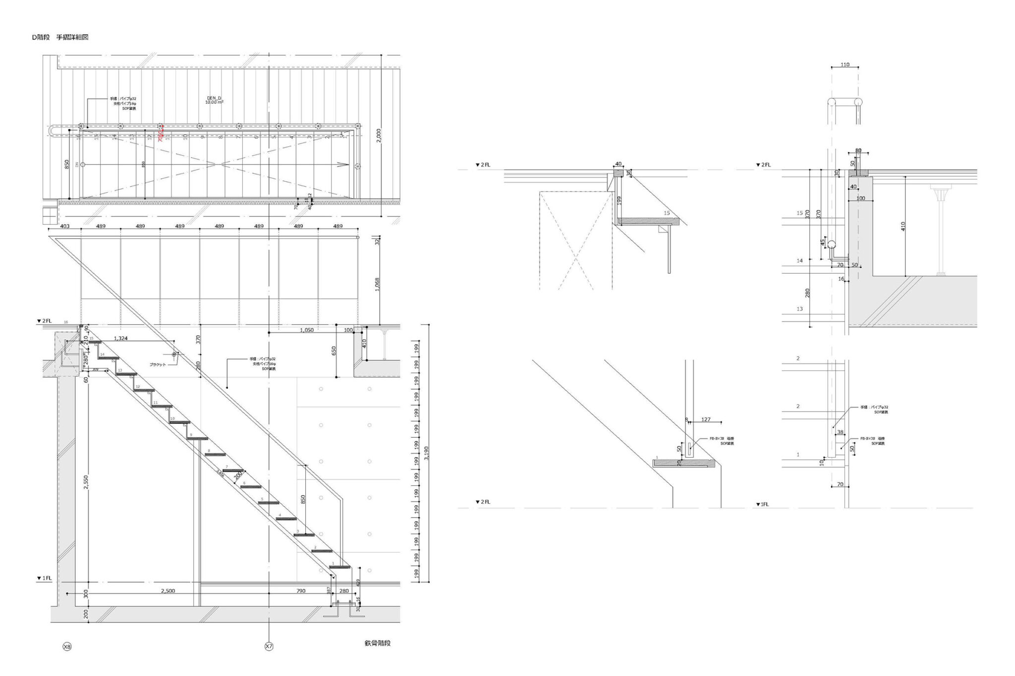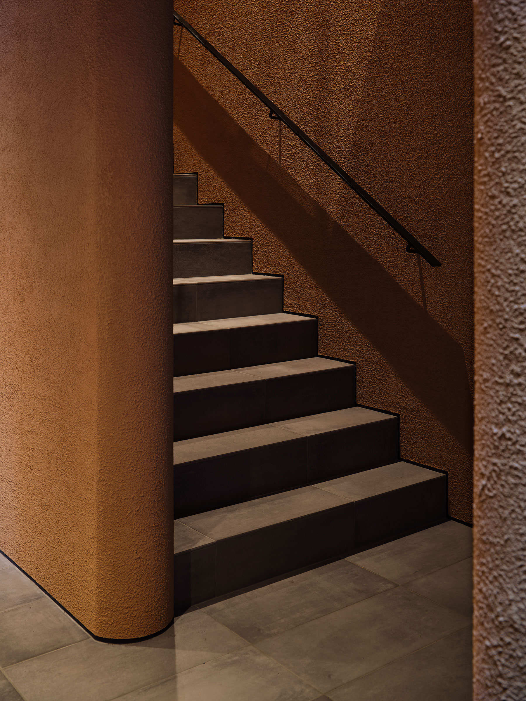 干田正浩 / MHAAによる、東京・目黒区の集合住宅「盤桓」。樹木が茂り“心地よい風”が流れる旧家の敷地での計画。木々を残し“風を取込む”建築を求め、内部から考えて“多様な住戸タイプ”を立体的に組合せる構成を考案。緑との補色関係を考慮して朱色のファサードとする階段詳細図 image©MHAA建築設計事務所