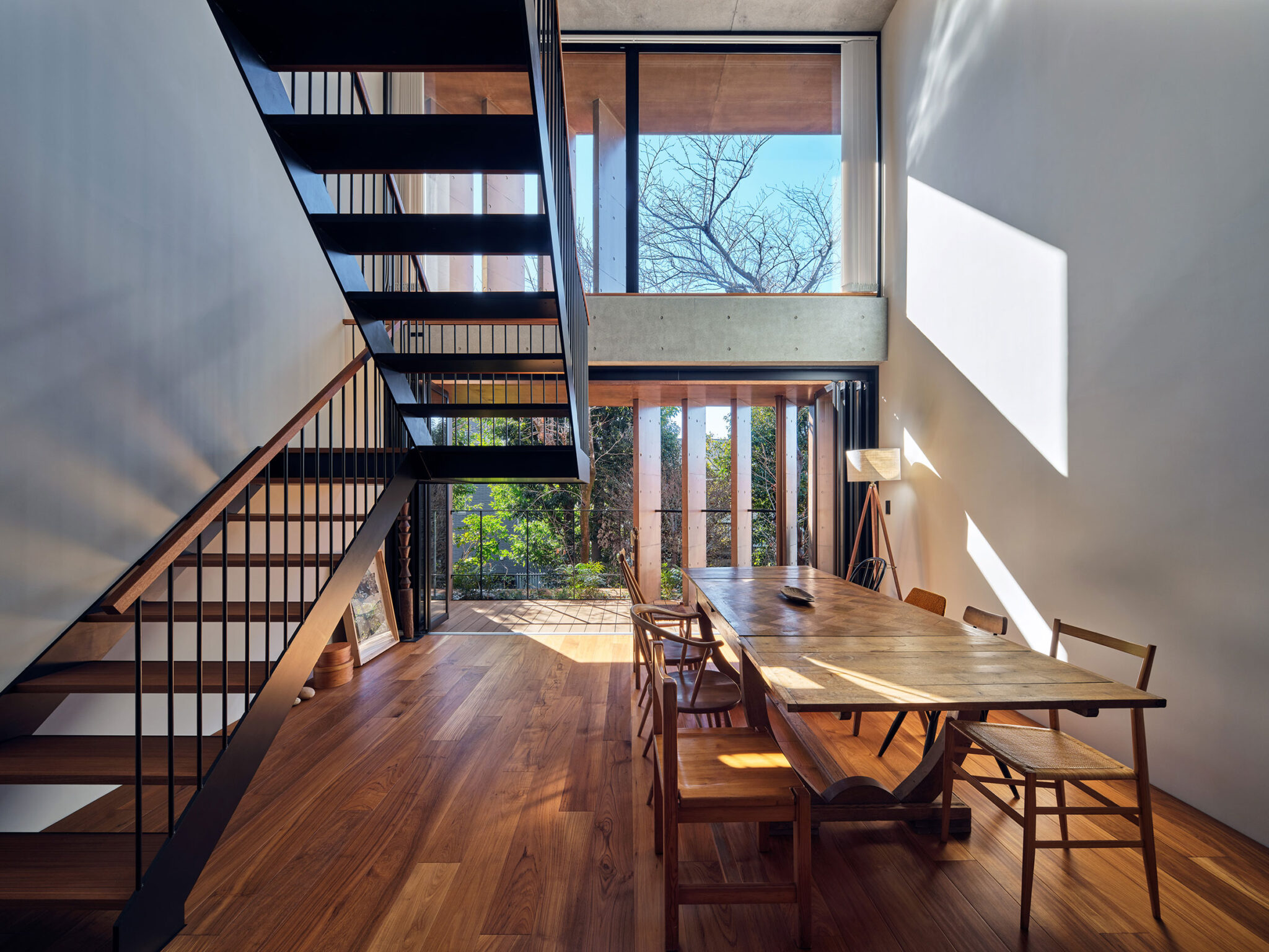 干田正浩 / MHAAによる、東京・目黒区の集合住宅「盤桓」。樹木が茂り“心地よい風”が流れる旧家の敷地での計画。木々を残し“風を取込む”建築を求め、内部から考えて“多様な住戸タイプ”を立体的に組合せる構成を考案。緑との補色関係を考慮して朱色のファサードとする2階、住戸G、ダイニングから開口部越しに外部を見る。(建築家による解説:テラスのラダーウォールは風だけでなく、視線や直射光もコントロールする) photo©藤井浩司 TOREAL
