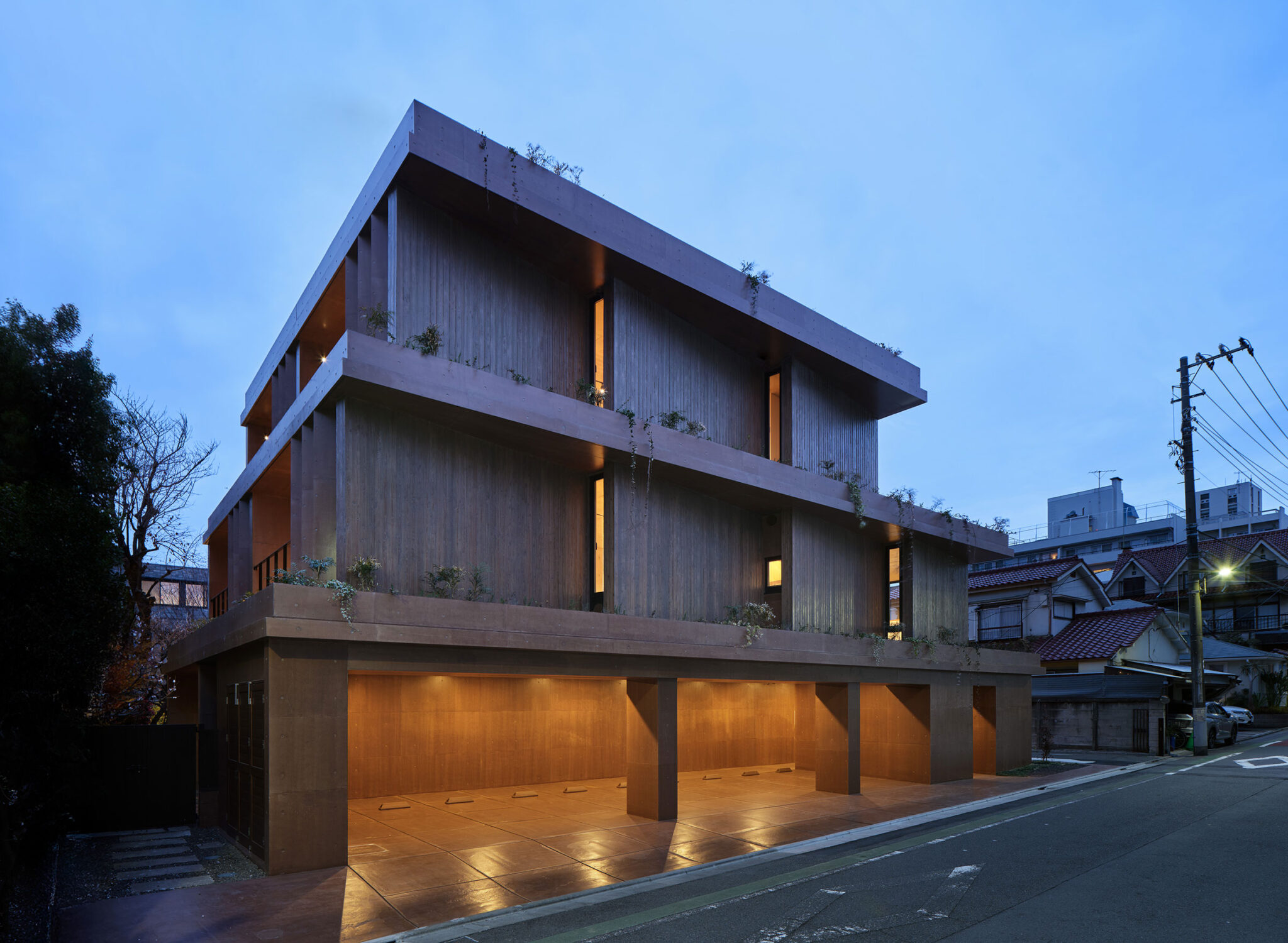 干田正浩 / MHAAによる、東京・目黒区の集合住宅「盤桓」。樹木が茂り“心地よい風”が流れる旧家の敷地での計画。木々を残し“風を取込む”建築を求め、内部から考えて“多様な住戸タイプ”を立体的に組合せる構成を考案。緑との補色関係を考慮して朱色のファサードとする外観、東側の道路から見る。夜景 photo©藤井浩司 TOREAL