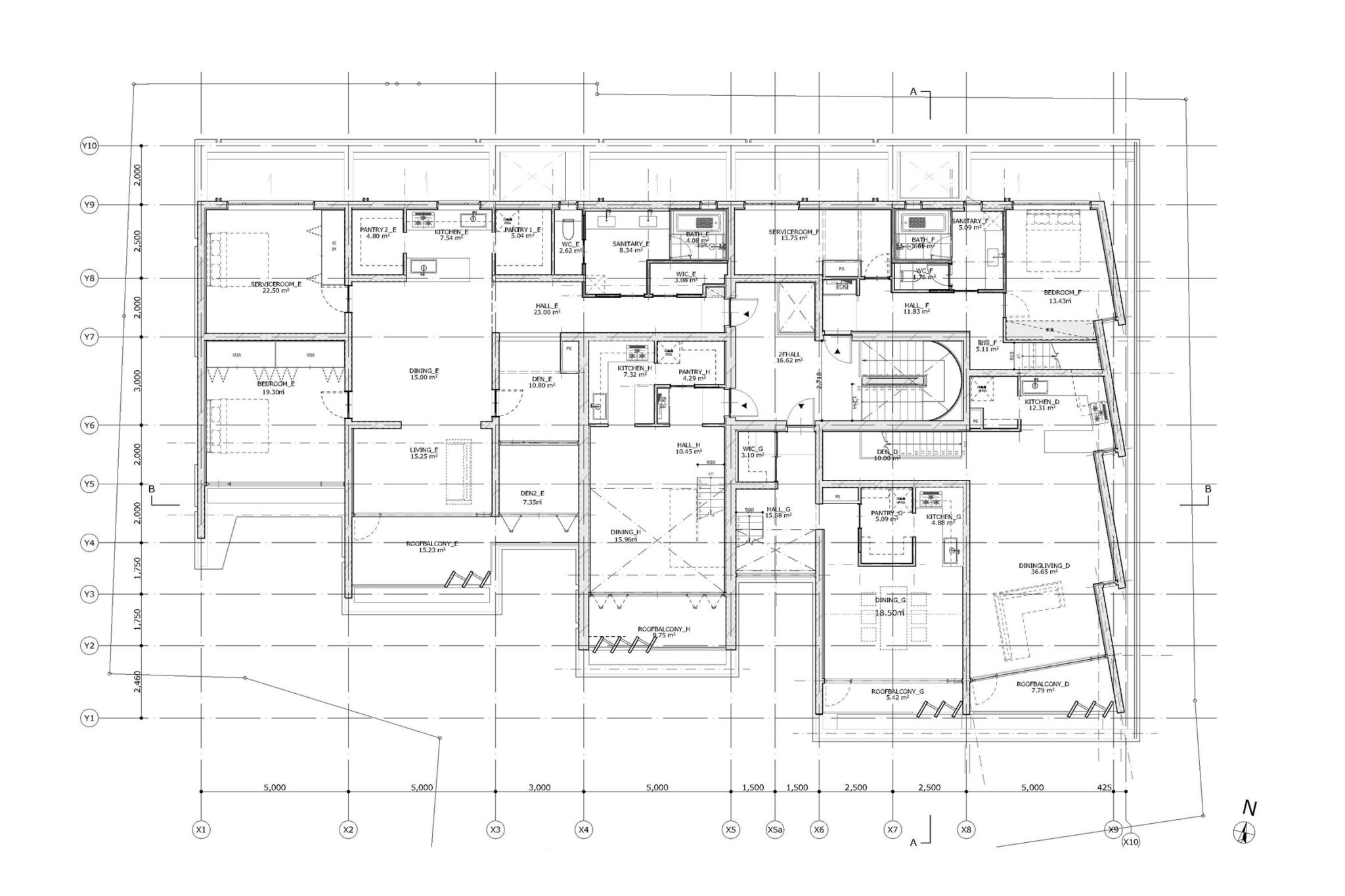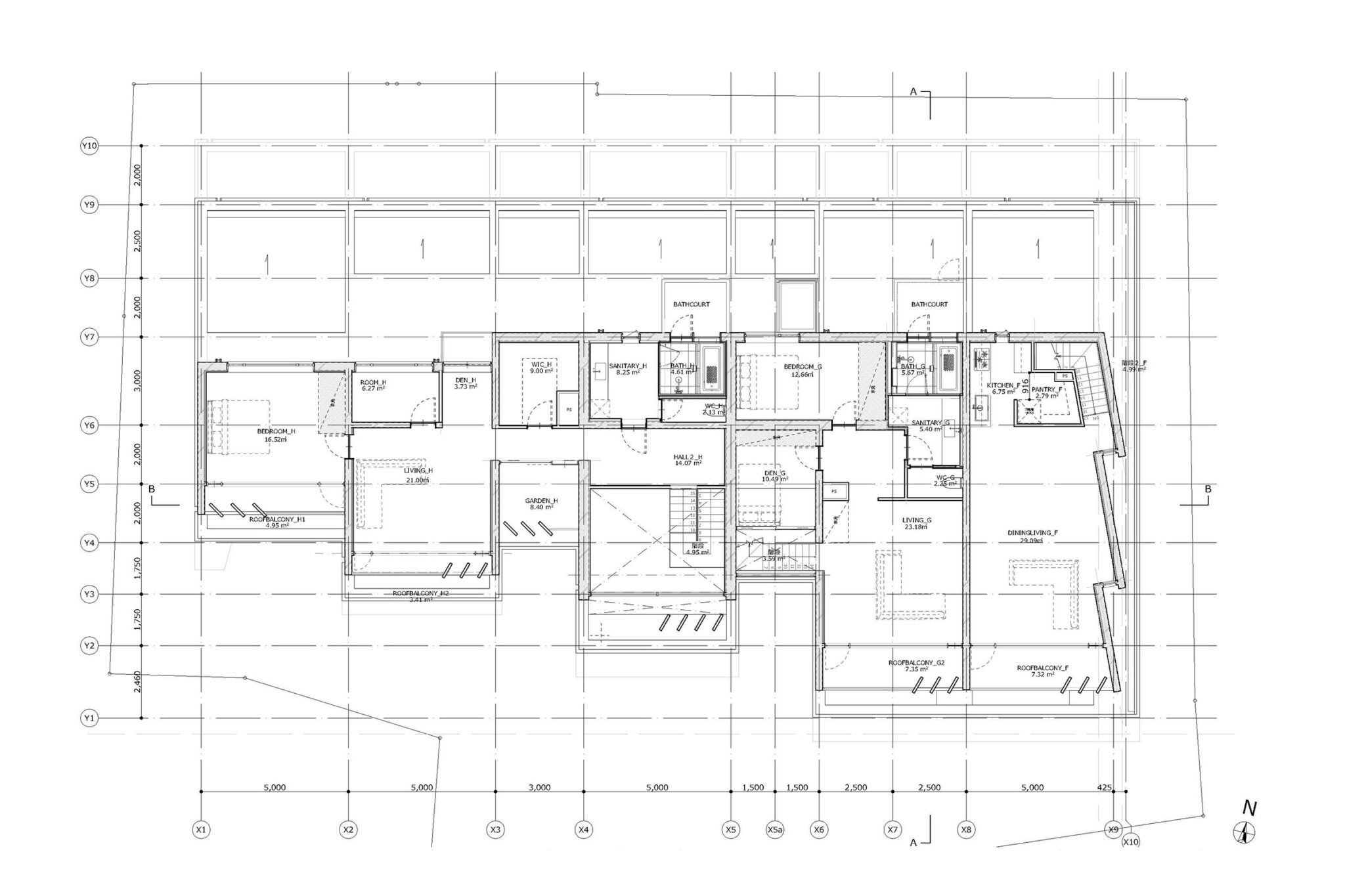 干田正浩 / MHAAによる、東京・目黒区の集合住宅「盤桓」。樹木が茂り“心地よい風”が流れる旧家の敷地での計画。木々を残し“風を取込む”建築を求め、内部から考えて“多様な住戸タイプ”を立体的に組合せる構成を考案。緑との補色関係を考慮して朱色のファサードとする2階平面図 image©MHAA建築設計事務所