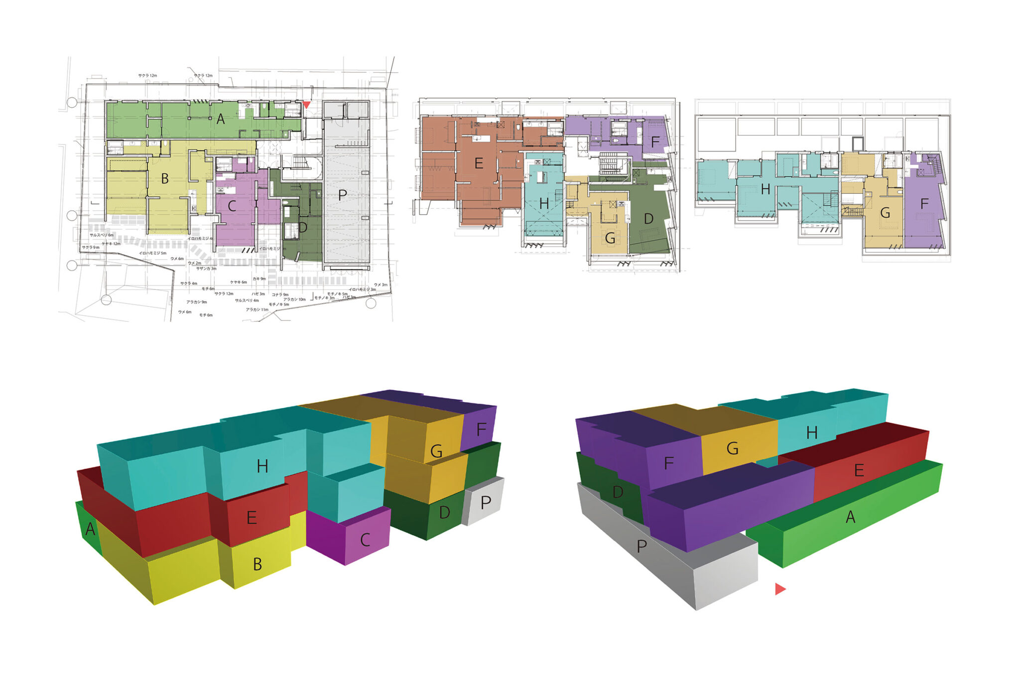 共用部を最小限とした結果、1–2階メゾネット、2–3階メゾネット、単層住戸が混在し、全住戸が異なる独立したプラン構成となった。