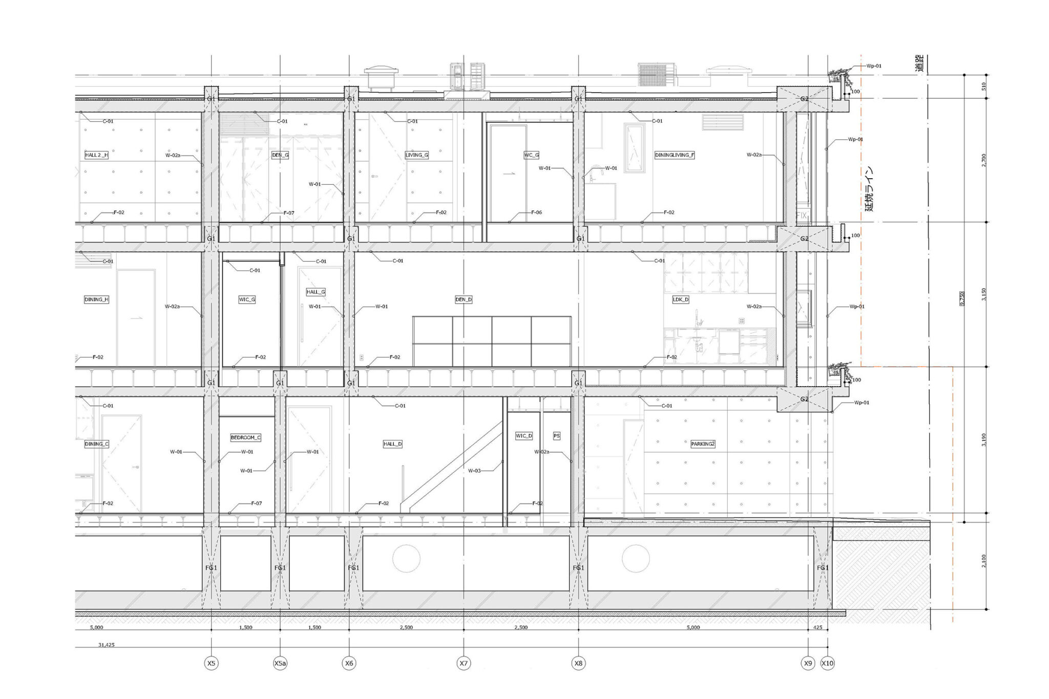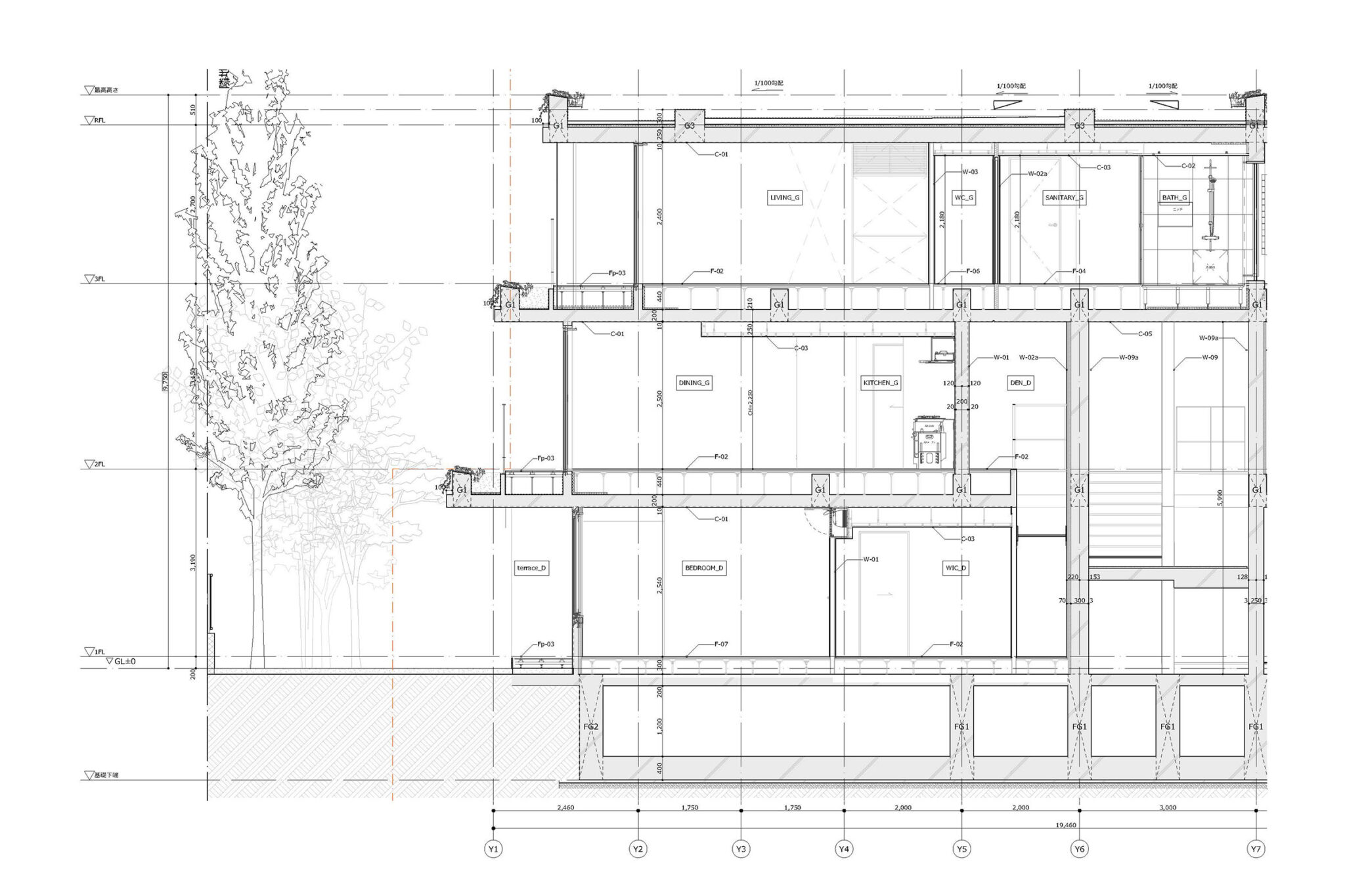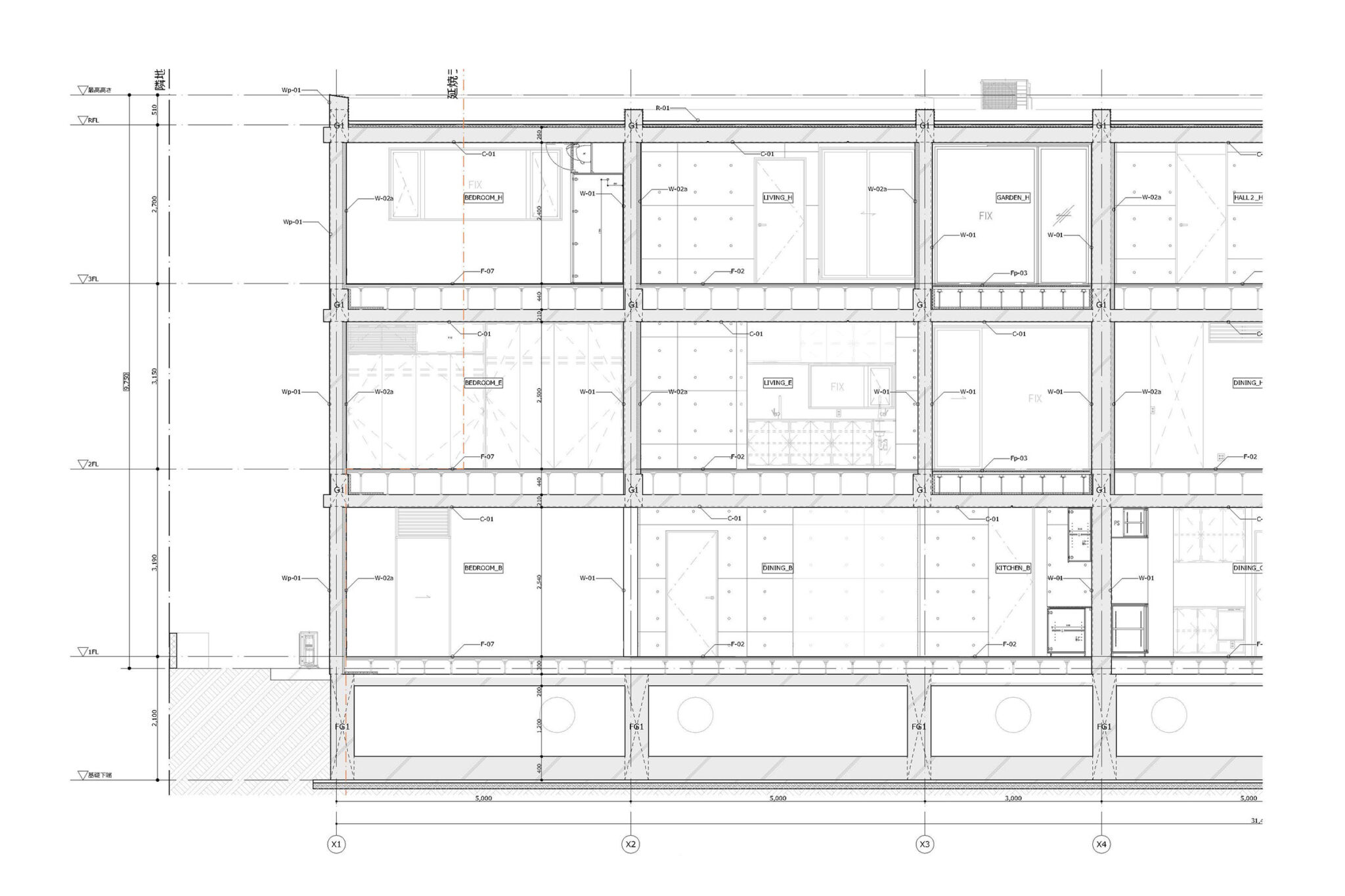 干田正浩 / MHAAによる、東京・目黒区の集合住宅「盤桓」。樹木が茂り“心地よい風”が流れる旧家の敷地での計画。木々を残し“風を取込む”建築を求め、内部から考えて“多様な住戸タイプ”を立体的に組合せる構成を考案。緑との補色関係を考慮して朱色のファサードとする矩計図 image©MHAA建築設計事務所