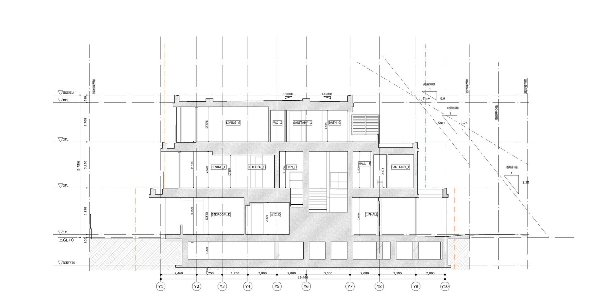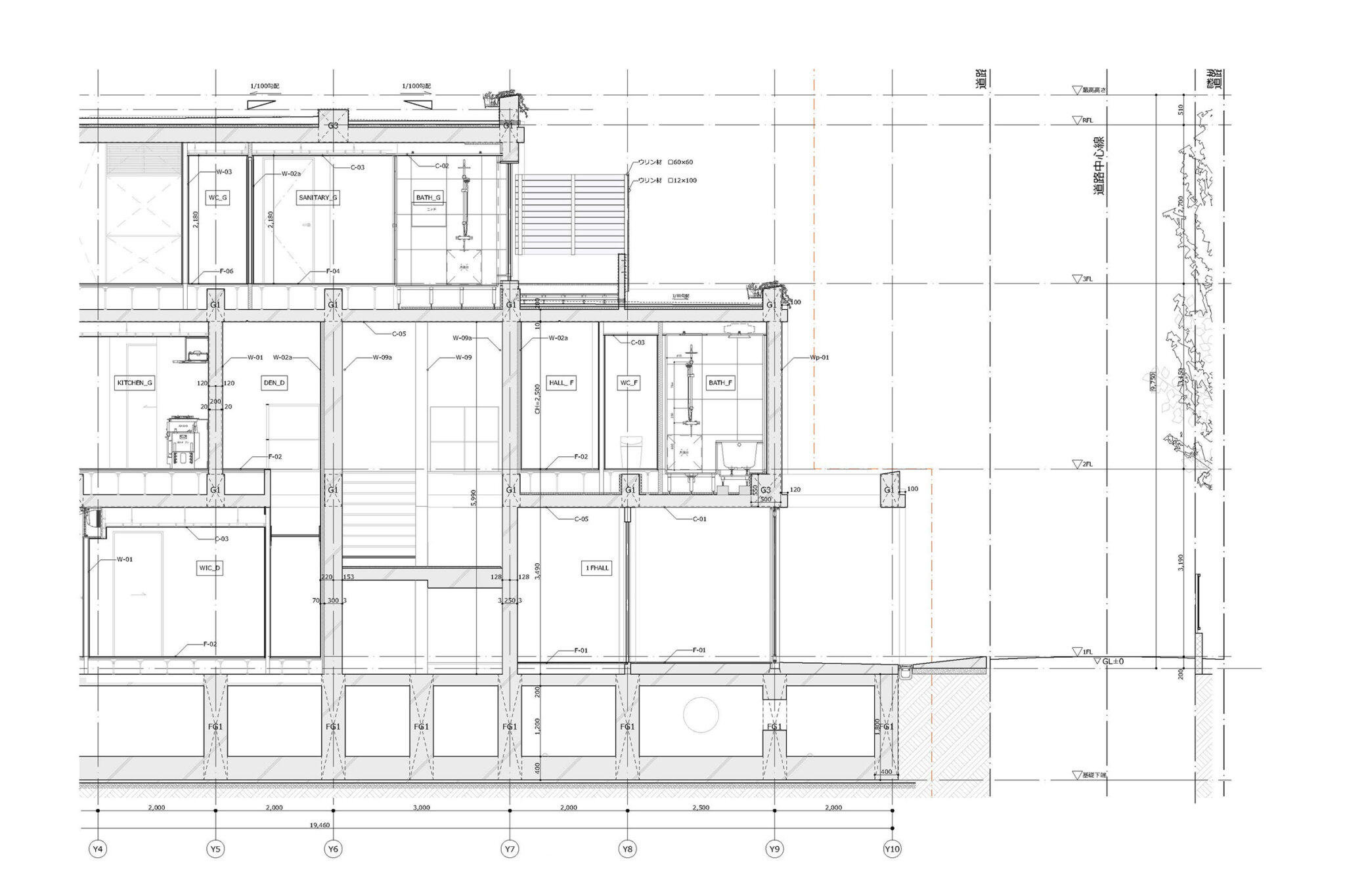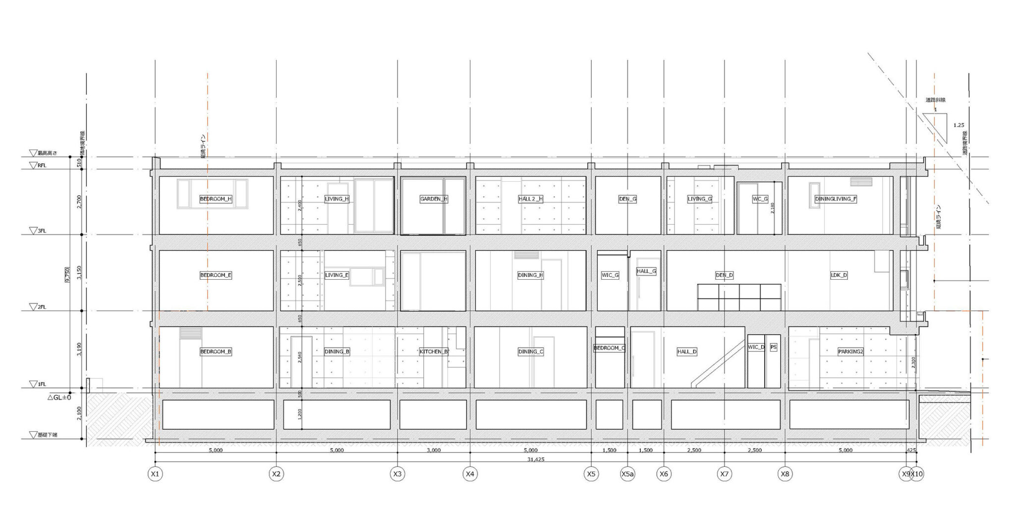 干田正浩 / MHAAによる、東京・目黒区の集合住宅「盤桓」。樹木が茂り“心地よい風”が流れる旧家の敷地での計画。木々を残し“風を取込む”建築を求め、内部から考えて“多様な住戸タイプ”を立体的に組合せる構成を考案。緑との補色関係を考慮して朱色のファサードとする矩計図 image©MHAA建築設計事務所