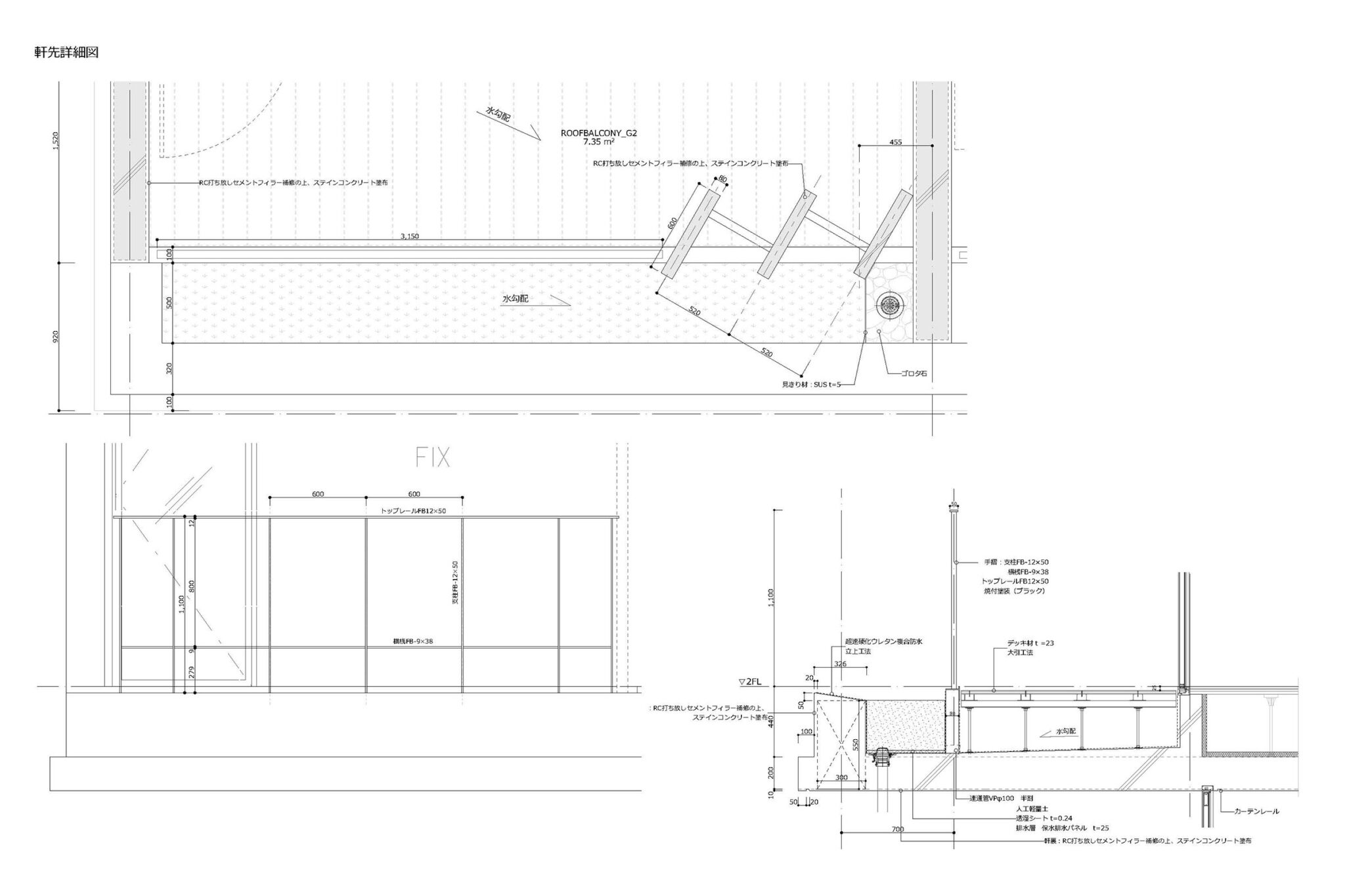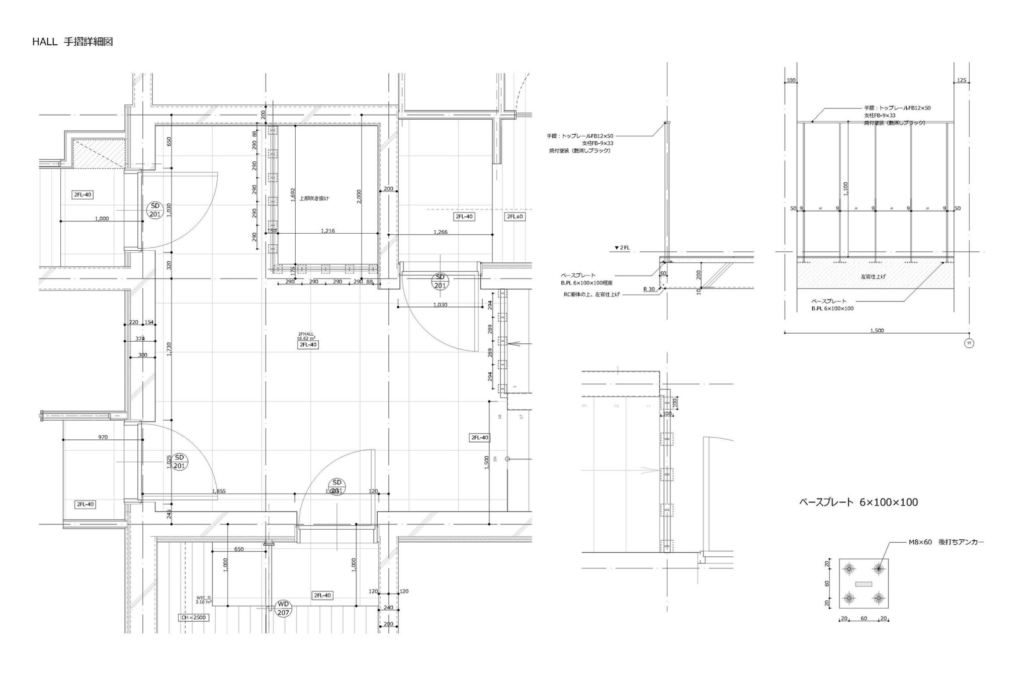 干田正浩 / MHAAによる、東京・目黒区の集合住宅「盤桓」。樹木が茂り“心地よい風”が流れる旧家の敷地での計画。木々を残し“風を取込む”建築を求め、内部から考えて“多様な住戸タイプ”を立体的に組合せる構成を考案。緑との補色関係を考慮して朱色のファサードとする手摺詳細図 image©MHAA建築設計事務所