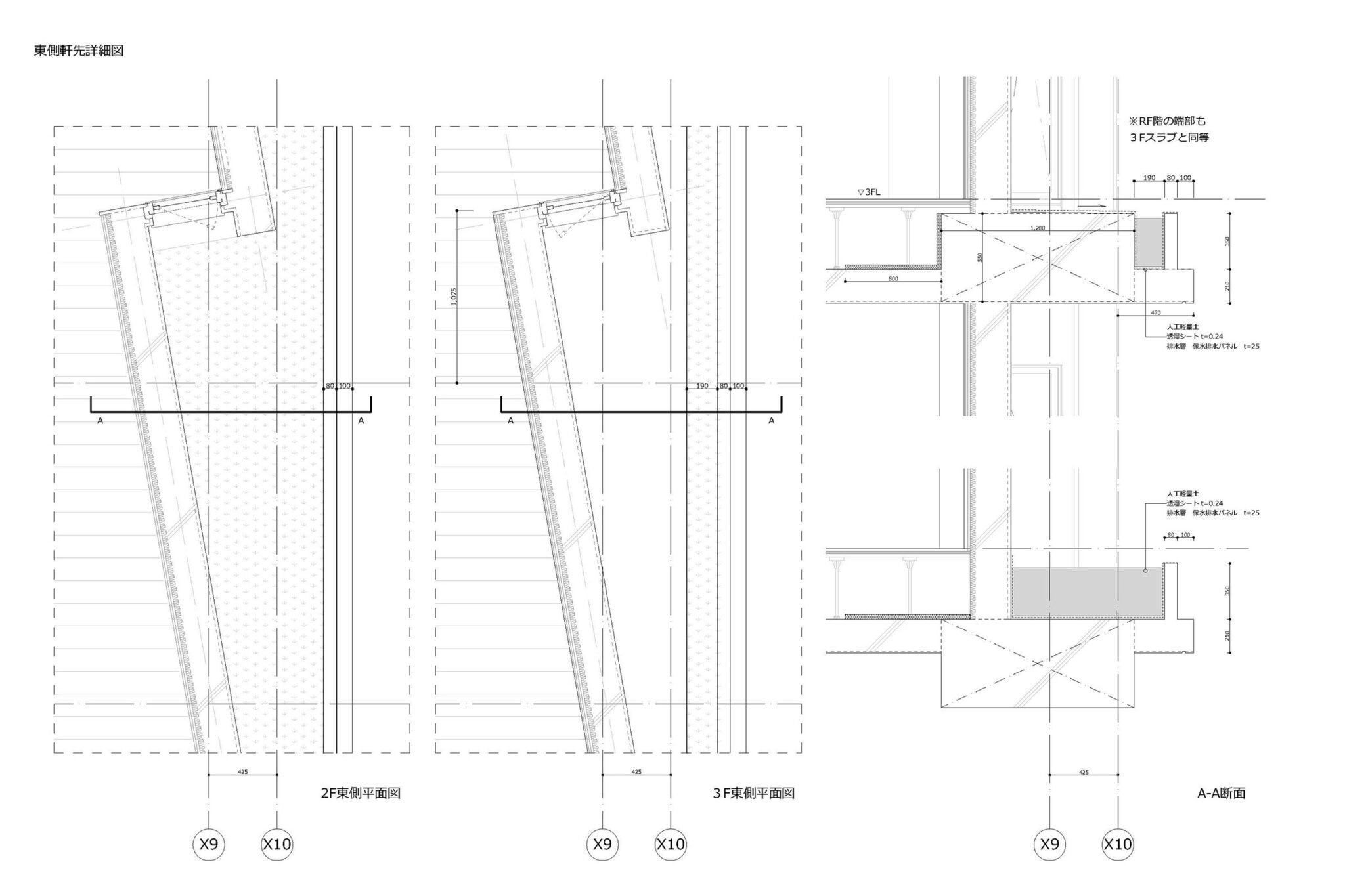 干田正浩 / MHAAによる、東京・目黒区の集合住宅「盤桓」。樹木が茂り“心地よい風”が流れる旧家の敷地での計画。木々を残し“風を取込む”建築を求め、内部から考えて“多様な住戸タイプ”を立体的に組合せる構成を考案。緑との補色関係を考慮して朱色のファサードとする軒先詳細図 image©MHAA建築設計事務所
