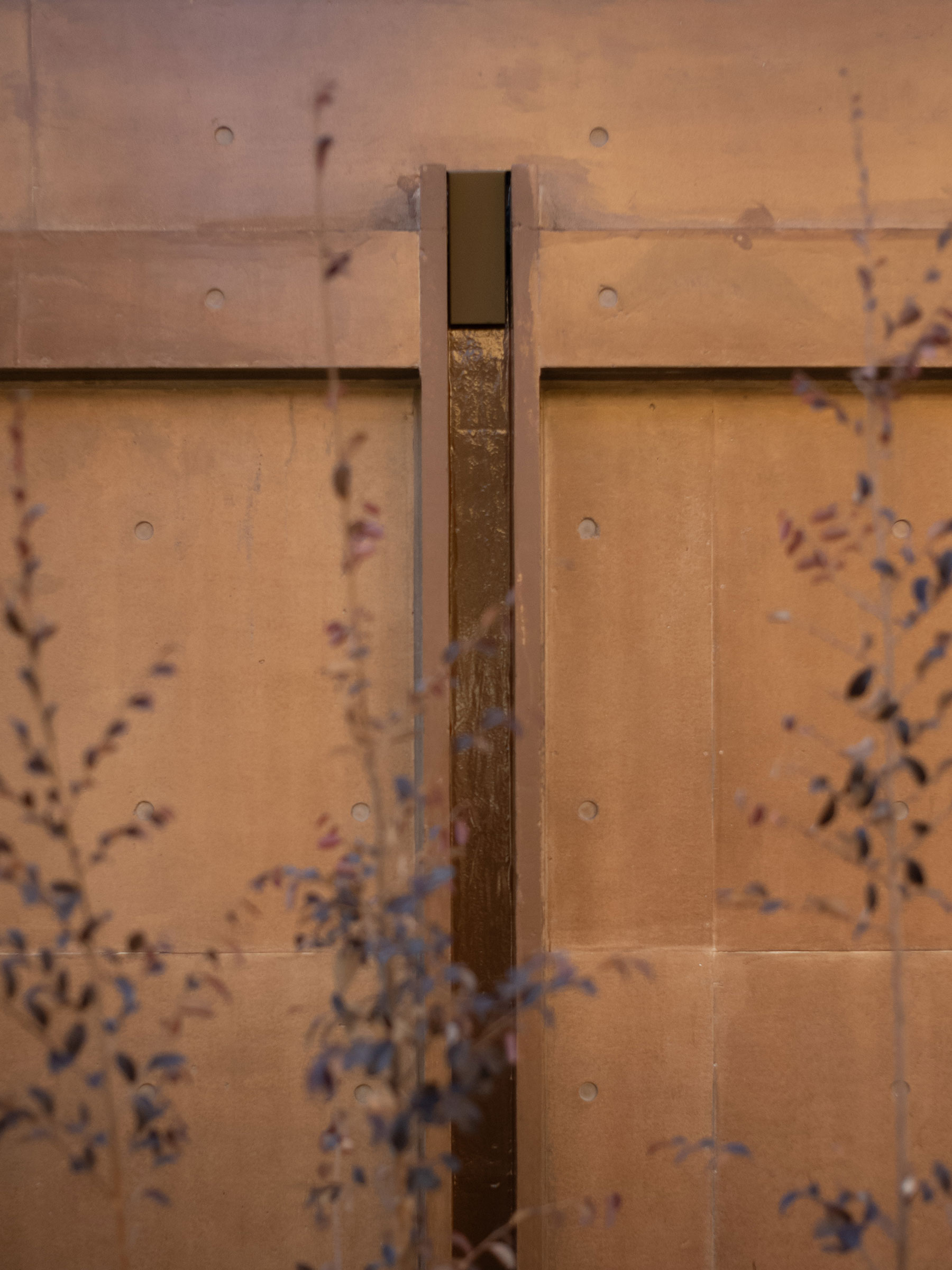 干田正浩 / MHAAによる、東京・目黒区の集合住宅「盤桓」。樹木が茂り“心地よい風”が流れる旧家の敷地での計画。木々を残し“風を取込む”建築を求め、内部から考えて“多様な住戸タイプ”を立体的に組合せる構成を考案。緑との補色関係を考慮して朱色のファサードとする外観、樋の詳細 photo©MHAA建築設計事務所