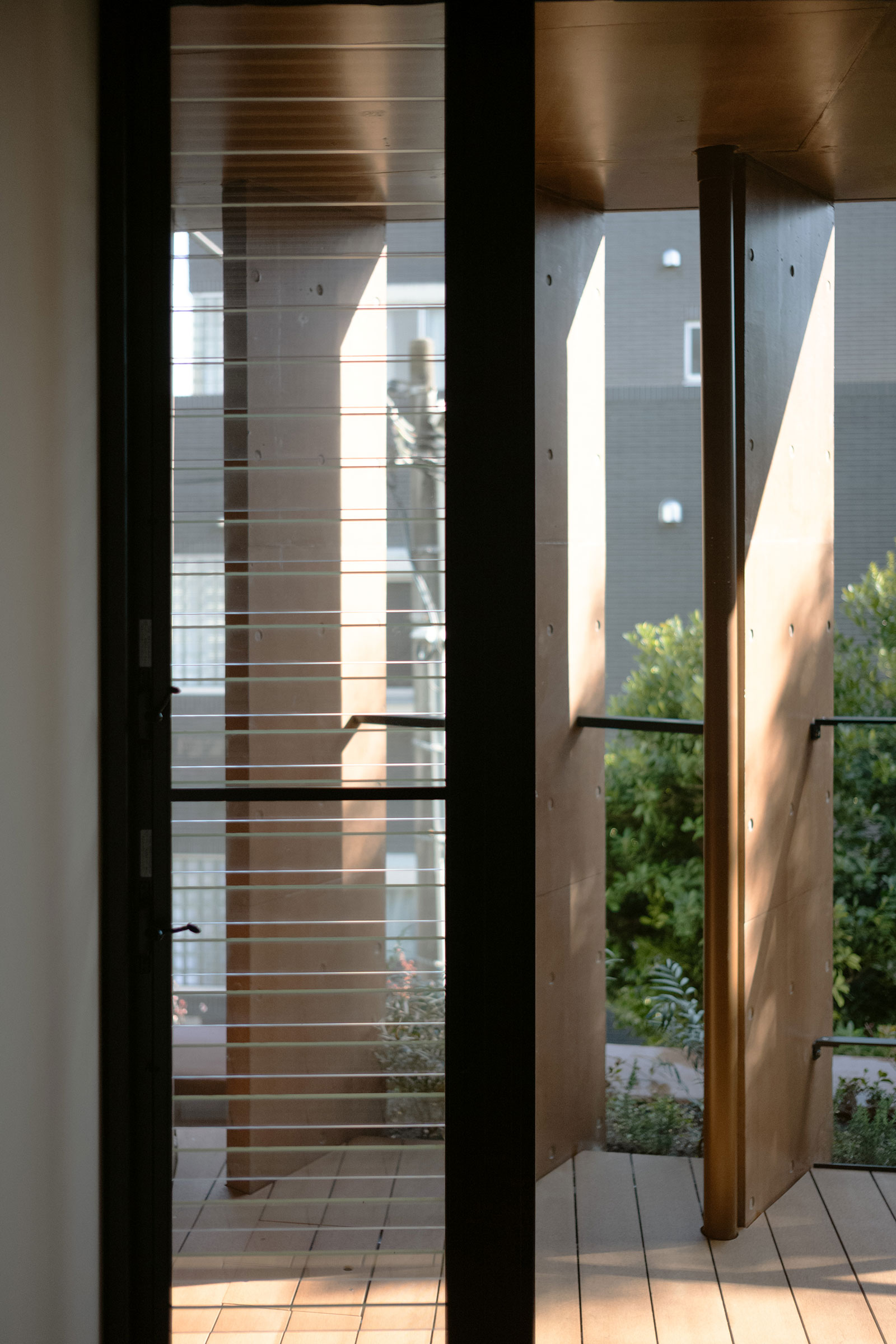 南側住戸には、敷地を横断する風を取り込むため、ラダーウォール(斜めの採風壁)を設置。誘引された風はジャロジー窓によって調整され、室内へと導かれる。この壁は同時に、通りからの視線や直射日光をやわらかく制御する役割も担っている。