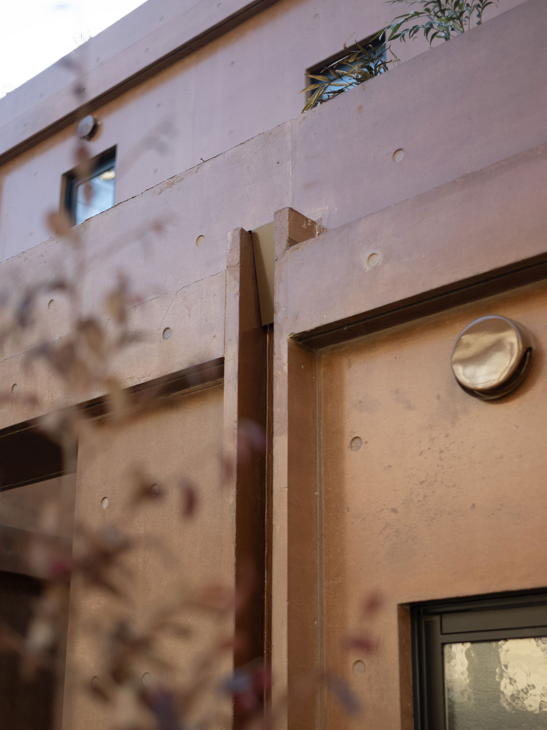 干田正浩 / MHAAによる、東京・目黒区の集合住宅「盤桓」。樹木が茂り“心地よい風”が流れる旧家の敷地での計画。木々を残し“風を取込む”建築を求め、内部から考えて“多様な住戸タイプ”を立体的に組合せる構成を考案。緑との補色関係を考慮して朱色のファサードとする開放樋ディテール image©MHAA建築設計事務所