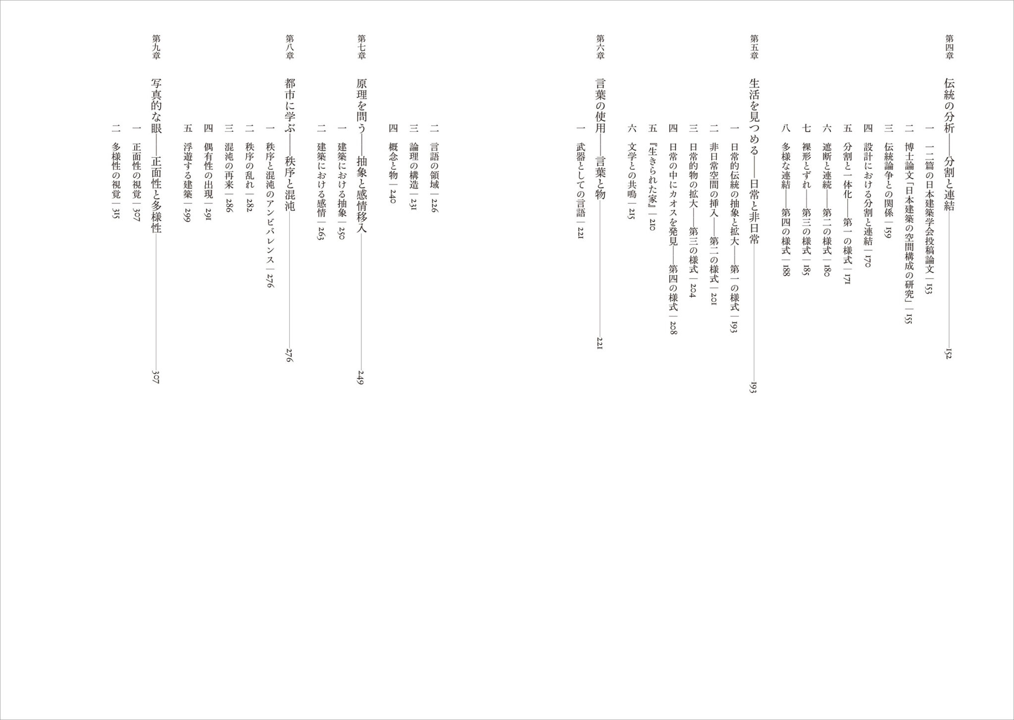 本書は、伝統的な日本建築を根拠地とする初期の「第一の様式」から、都市の混沌へと接近する後期の「第四の様式」までの創造の軌跡をたどり、設計、実作、言説の分析を通して類稀なる実験精神の実相に迫る。