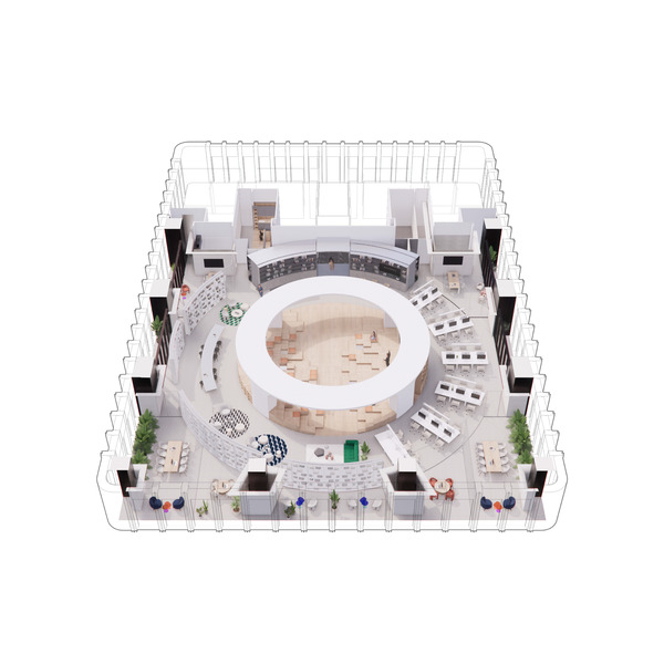 ワークスペースの核として、志と可能性が交わる空間であるこのフォーラムは、人々がとどまり、ライブラリーに没入することを促します。この開かれたパブリックスペースを取り囲む最初のリングには、特注の本棚によって豊かにされたインフォーマルなワーキングおよびシーティングゾーンが配置されています。ワークステーションは半円形の構成で配置され、活発なエッジと交差する動線を生み出します。フォーラムの内部と外の都市の方への眺望を備えたワークステーションは、流れるような円形の回遊動線を形づくり、一日を通して偶然の出会いを促します。