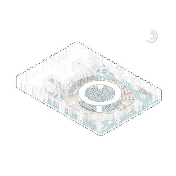 As the nucleus of the workspace, a space where aspirations converge with possibilities, the forum invites people to linger and immerse themselves in the library. In the first ring encircling this open public space is an informal working and seating zone enriched by custom bookshelves. Workstations are arranged in a semi-circular configuration that generates active edges and cross-traffic. With views into the forum and out toward the city, the workstations frame a fluid circular walkway, fostering chance encounters throughout the day.