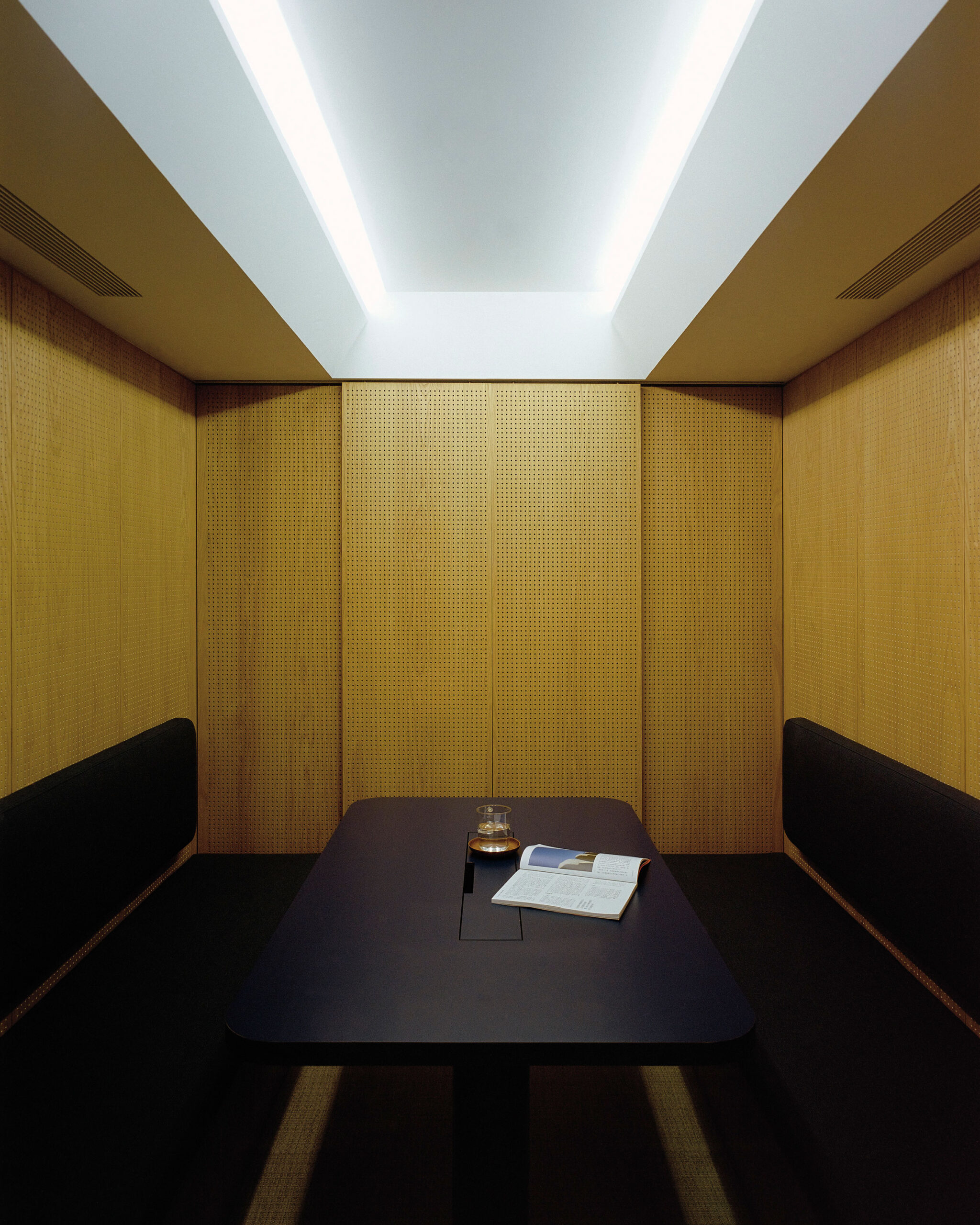 第2のリングにはバーとカフェテリアが設けられ、同僚やクライアントが交流するソーシャルハブを形成しています。バーの両側には、ボードルームではなくラウンジとして構想されたセミプライベートのミーティングエリアが配置されており、ソファやアームチェアが備えられ、リラックスした会話のための場となっています。機密性の高い会話のためのガラスで囲われたプライベートミーティングルームは、周縁部の四隅に配置され、採光を損なうことなく機密性を確保しています。
