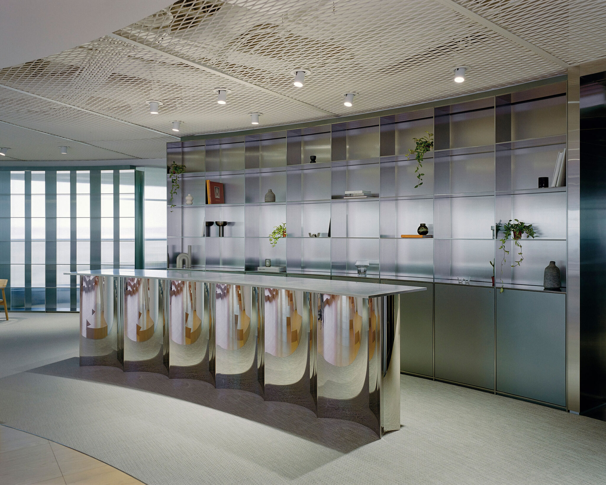 A refined material palette of wood, glass, and metal lends the space a timeless elegance. Warm timber defines the central forum, while custom metalwork with reflective finishes amplifies the presence of wood and introduces a contemporary edge. Sleekmetal elements – such as the reception desk, bar counter, and bookshelves – act as transitional pieces between the forum and workstations. Soft, colorful furnishings demarcate zones for group discussions within the forum. The fluted glass partitions lining the meeting rooms diffuse daylight and city views to permeate through the space, all the way into the forum that is designed to serve one, many, or all. Sustainable Bolon flooring features across all spaces, adding depth and warmth.