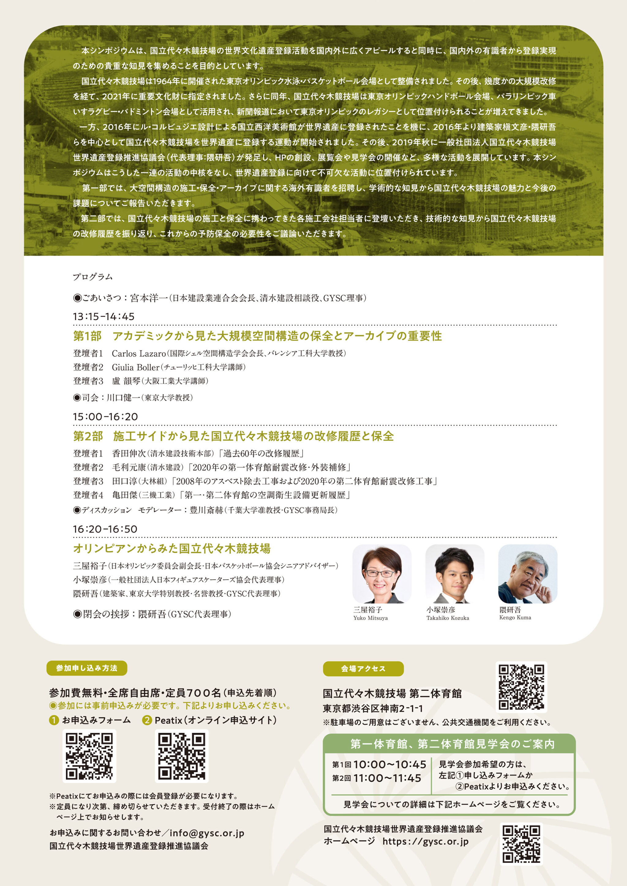 一方、2016年にル・コルビュジエ設計による国立西洋美術館が世界遺産に登録されたことを機に、2016年より建築家槇文彦・隈研吾らを中心として国立代々木競技場を世界遺産に登録する運動が開始されました。その後、2019年秋に一般社団法人国立代々木競技場世界遺産登録推進協議会(代表理事:隈研吾)が発足し、HPの創設、展覧会や見学会の開催など、多様な活動を展開しています。本シンポジウムはこうした一連の活動の中核をなし、世界遺産登録に向けて不可欠な活動に位置付けられています。