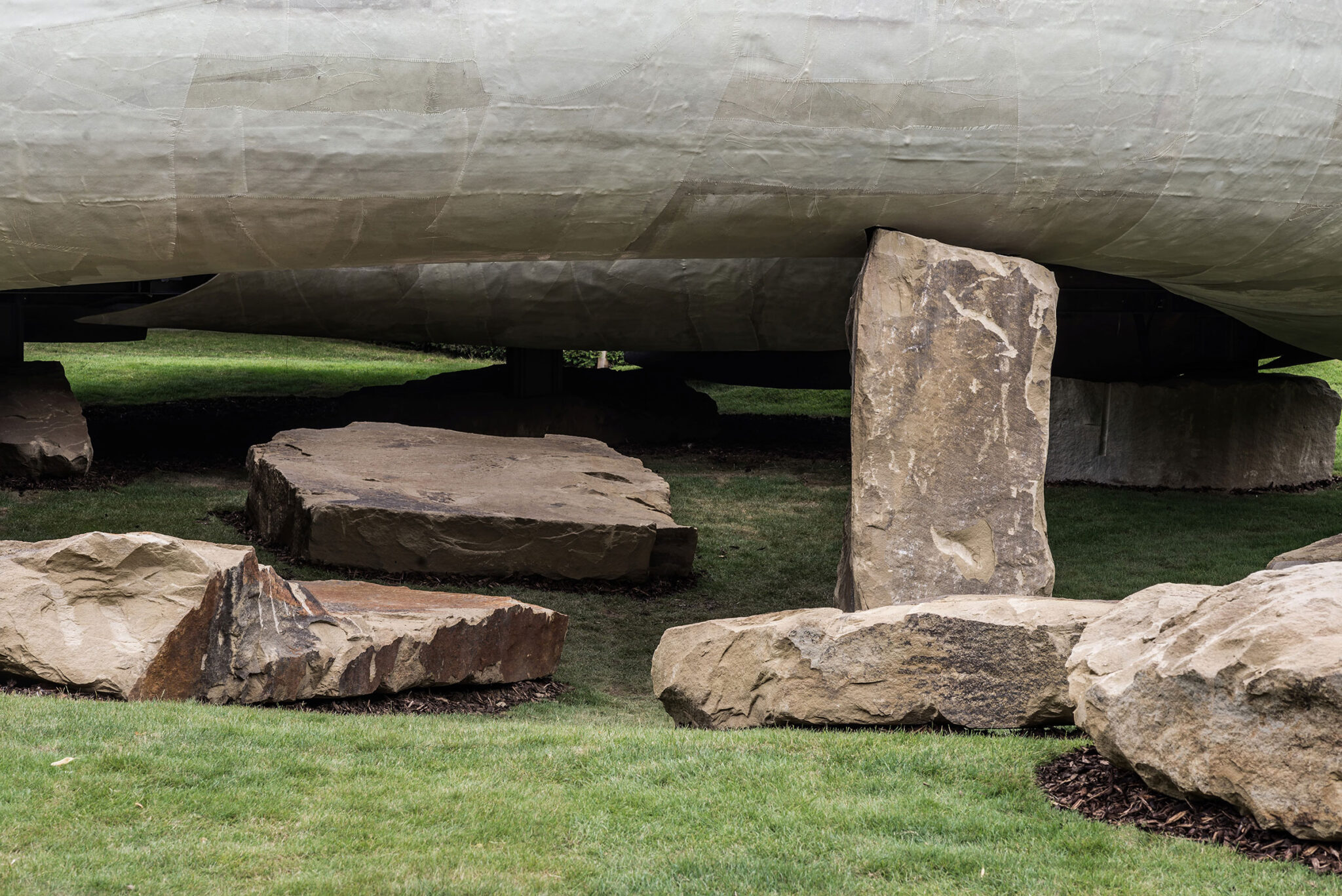 Serpentine Gallery Pavilion presents shelter as a seemingly-suspended condition. A translucent fiberglass shell appears to hover above the lawn of Kensington Gardens, resting improbably on a ring of immense load-bearing, locally-sourced stones. The pavilion appears both ancient and provisional, anchored by the gravity of stone and animated by the shifting daylight filtered through its skin. Light is filtered rather than displayed; the structure is neither fully enclosed nor entirely open. Though temporary, the pavilion proposes a primordial reading of architecture, where mass, surface, and ground are in deliberate equilibrium.