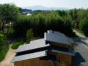 藤田時彦 / atelier umiによる、滋賀・高島市の「安曇川の家」。豊かな自然に囲まれた大きな敷地。施主の“森の中に住みたい”という要望を起点とし、“森のような要素”を空間に導入する計画を志向。天井高の変化と“柔らかなアール”の連続で木々の下を歩く様な感覚を生み出す俯瞰、東側より見下ろす。 photo©貝出翔太郎
