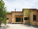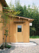 藤田時彦 / atelier umiによる、滋賀・高島市の「安曇川の家」。豊かな自然に囲まれた大きな敷地。施主の“森の中に住みたい”という要望を起点とし、“森のような要素”を空間に導入する計画を志向。天井高の変化と“柔らかなアール”の連続で木々の下を歩く様な感覚を生み出す外観、敷地内の東側より「将来物販スペース」側を見る。 photo©貝出翔太郎