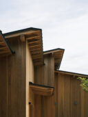 藤田時彦 / atelier umiによる、滋賀・高島市の「安曇川の家」。豊かな自然に囲まれた大きな敷地。施主の“森の中に住みたい”という要望を起点とし、“森のような要素”を空間に導入する計画を志向。天井高の変化と“柔らかなアール”の連続で木々の下を歩く様な感覚を生み出す外観、屋根と壁の詳細 photo©貝出翔太郎