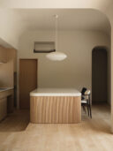 藤田時彦 / atelier umiによる、滋賀・高島市の「安曇川の家」。豊かな自然に囲まれた大きな敷地。施主の“森の中に住みたい”という要望を起点とし、“森のような要素”を空間に導入する計画を志向。天井高の変化と“柔らかなアール”の連続で木々の下を歩く様な感覚を生み出すダイニングからキッチンを見る。 photo©貝出翔太郎