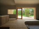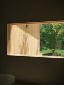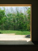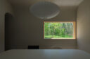 藤田時彦 / atelier umiによる、滋賀・高島市の「安曇川の家」。豊かな自然に囲まれた大きな敷地。施主の“森の中に住みたい”という要望を起点とし、“森のような要素”を空間に導入する計画を志向。天井高の変化と“柔らかなアール”の連続で木々の下を歩く様な感覚を生み出すリビングの開口部越しに外部を見る。 photo©貝出翔太郎