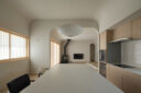 藤田時彦 / atelier umiによる、滋賀・高島市の「安曇川の家」。豊かな自然に囲まれた大きな敷地。施主の“森の中に住みたい”という要望を起点とし、“森のような要素”を空間に導入する計画を志向。天井高の変化と“柔らかなアール”の連続で木々の下を歩く様な感覚を生み出すリビングからキッチンとダイニング側を見る。 photo©貝出翔太郎