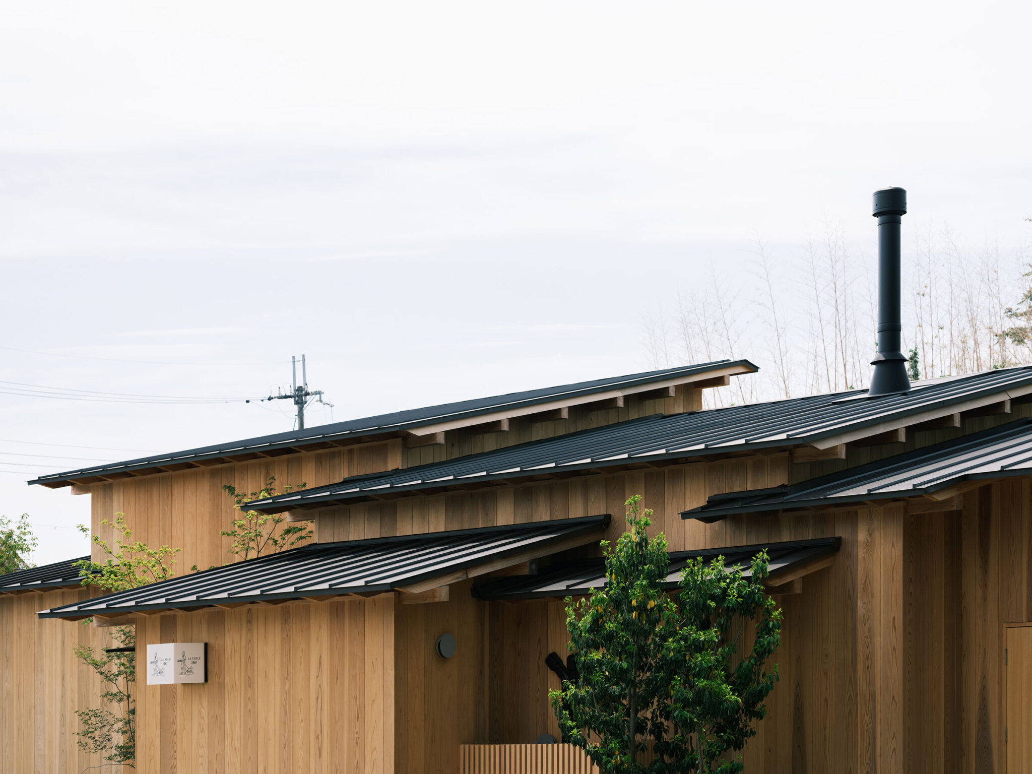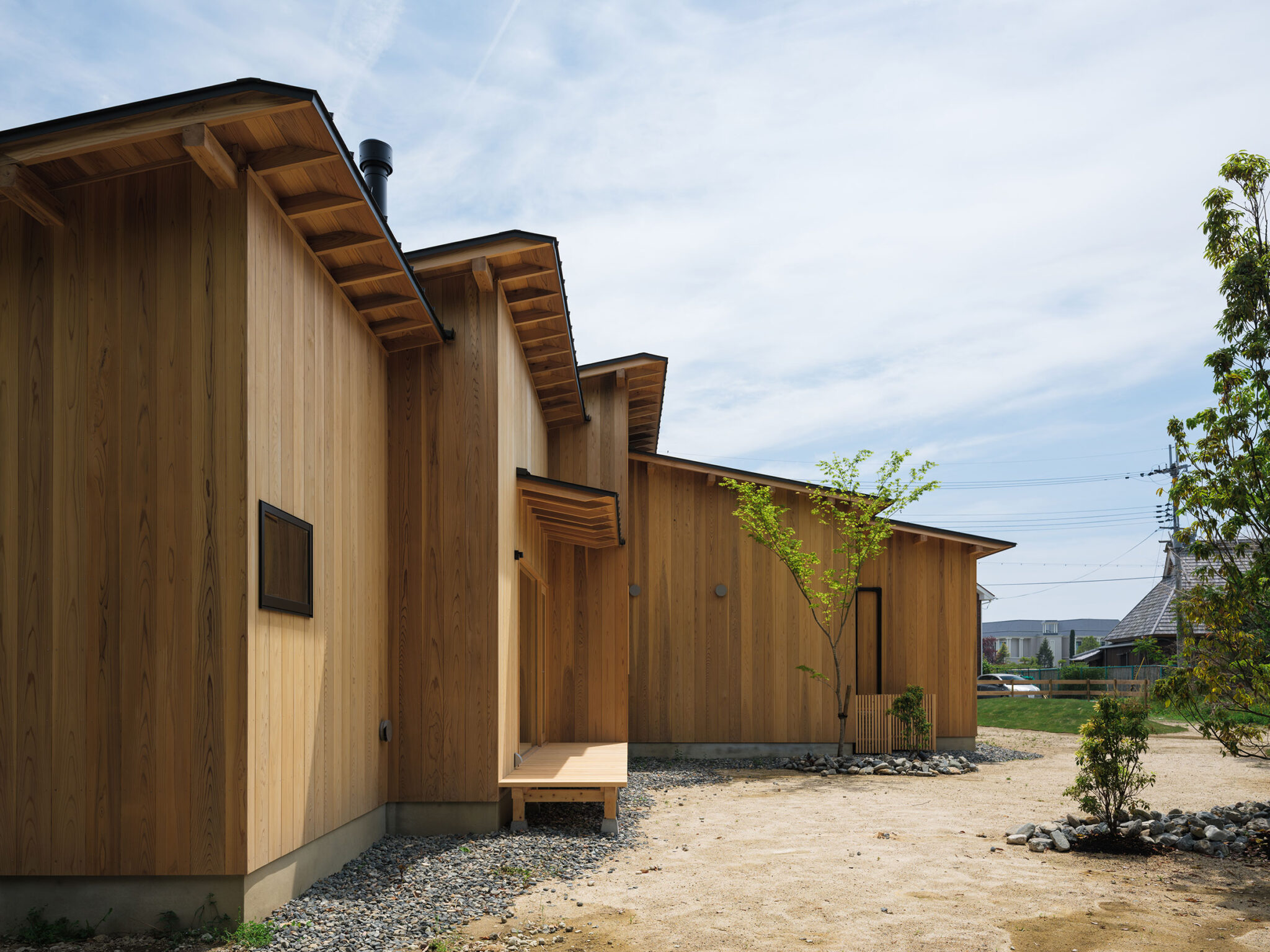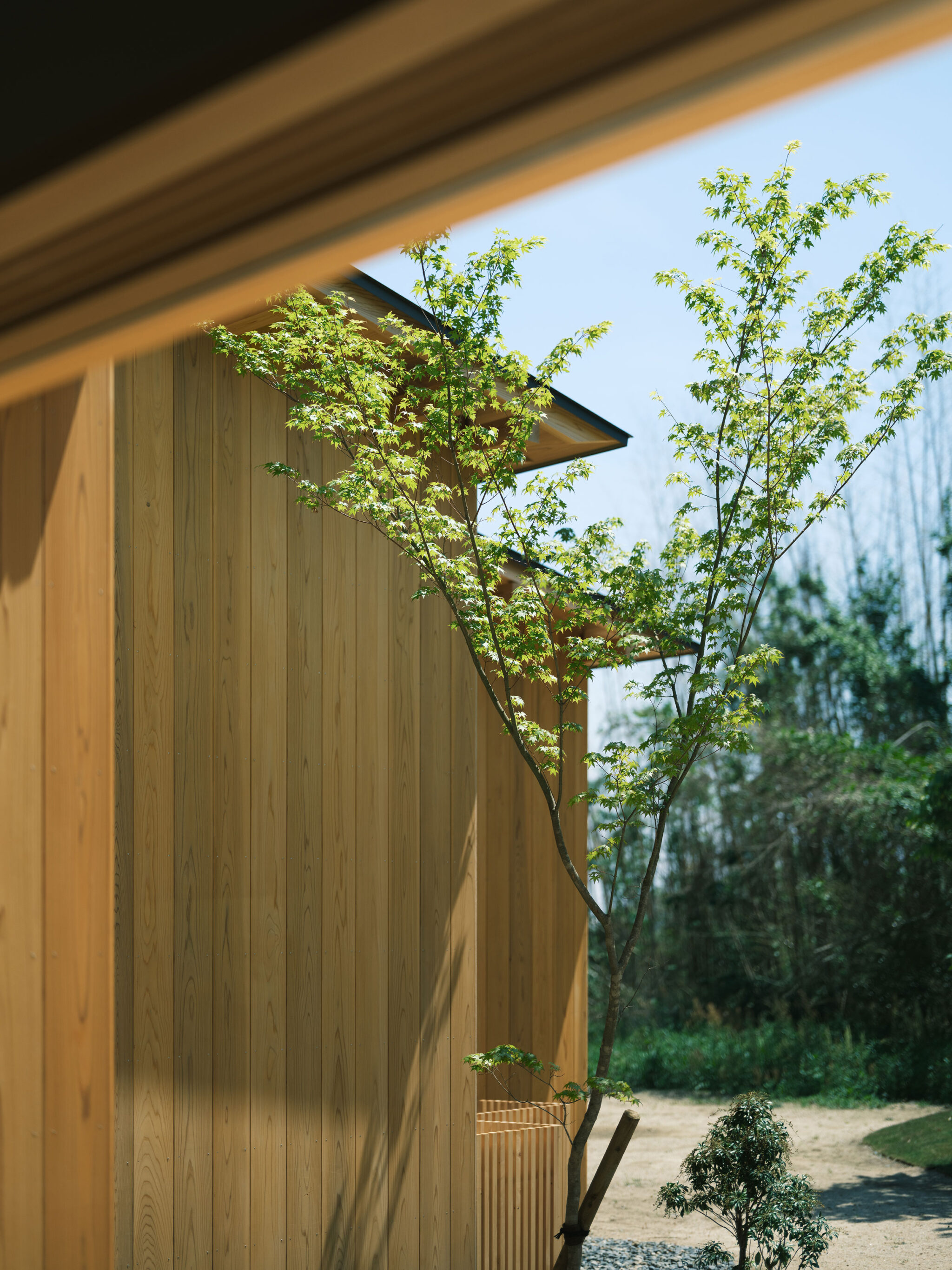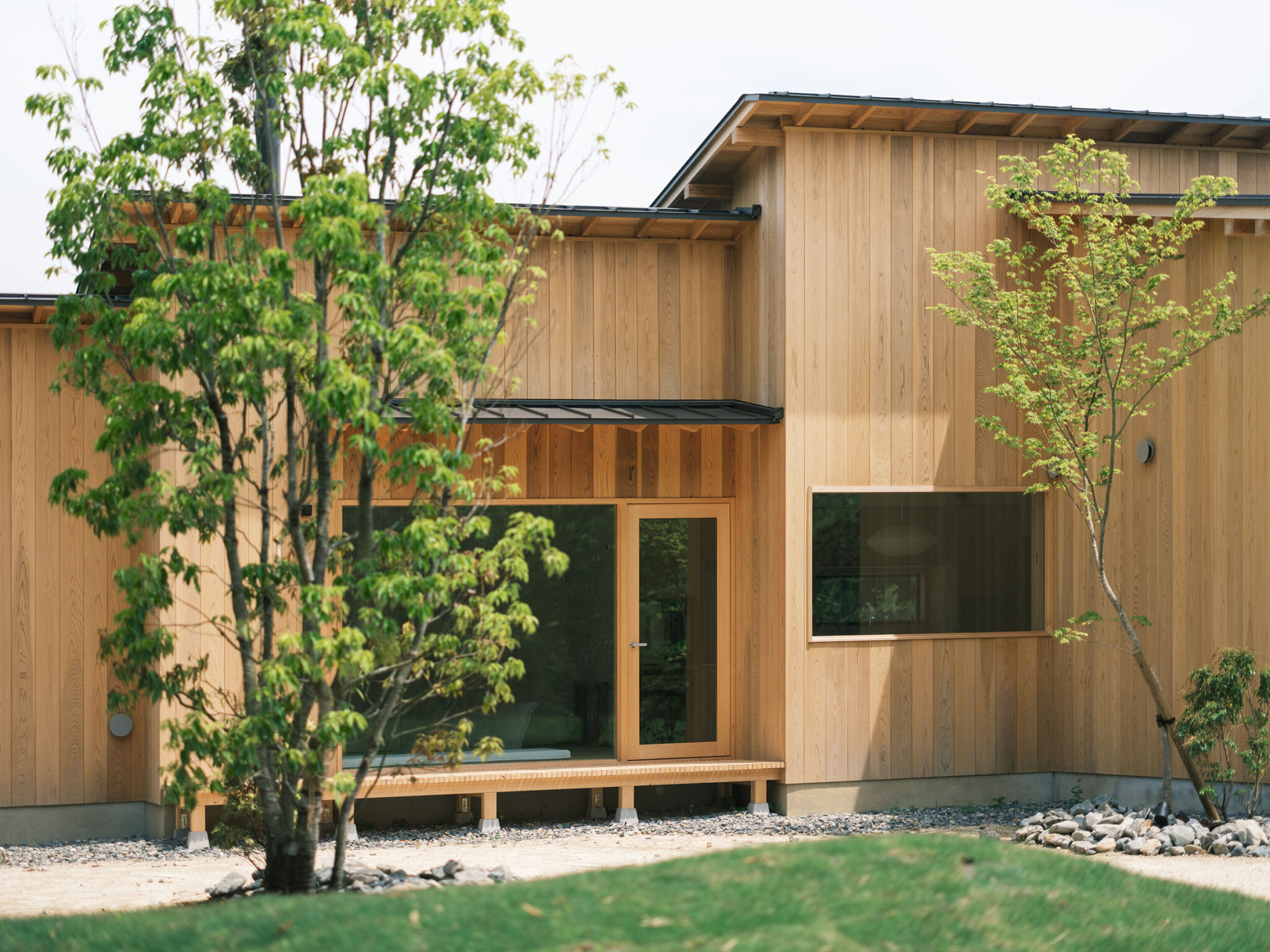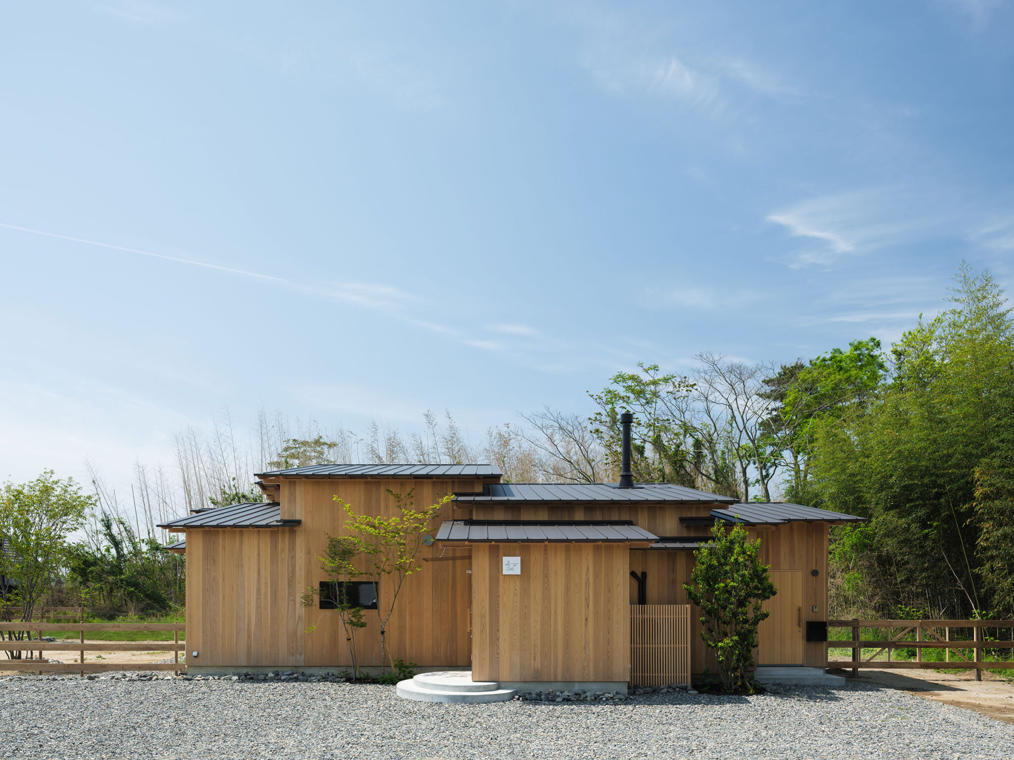 藤田時彦 / atelier umiによる、滋賀・高島市の「安曇川の家」。豊かな自然に囲まれた大きな敷地。施主の“森の中に住みたい”という要望を起点とし、“森のような要素”を空間に導入する計画を志向。天井高の変化と“柔らかなアール”の連続で木々の下を歩く様な感覚を生み出す外観、敷地内の東側より「将来物販スペース」側を見る。 photo©貝出翔太郎