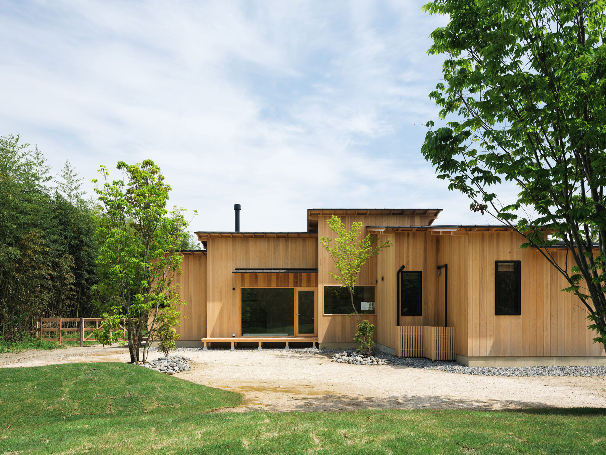 藤田時彦 / atelier umiによる、滋賀・高島市の「安曇川の家」。豊かな自然に囲まれた大きな敷地。施主の“森の中に住みたい”という要望を起点とし、“森のような要素”を空間に導入する計画を志向。天井高の変化と“柔らかなアール”の連続で木々の下を歩く様な感覚を生み出す外観、敷地内の南側より見る。 photo©貝出翔太郎