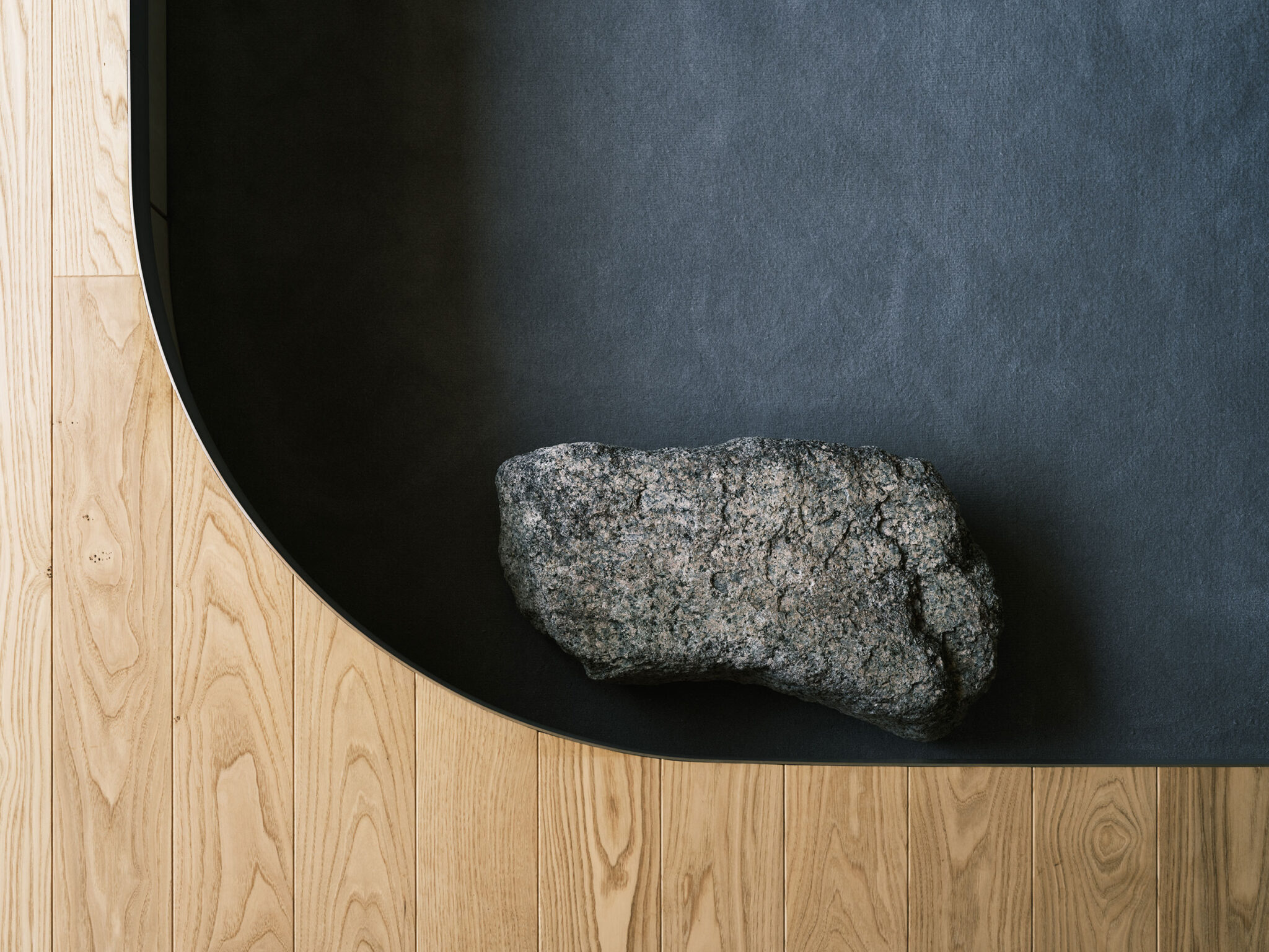 藤田時彦 / atelier umiによる、滋賀・高島市の「安曇川の家」。豊かな自然に囲まれた大きな敷地。施主の“森の中に住みたい”という要望を起点とし、“森のような要素”を空間に導入する計画を志向。天井高の変化と“柔らかなアール”の連続で木々の下を歩く様な感覚を生み出すリビング、床の詳細 photo©貝出翔太郎