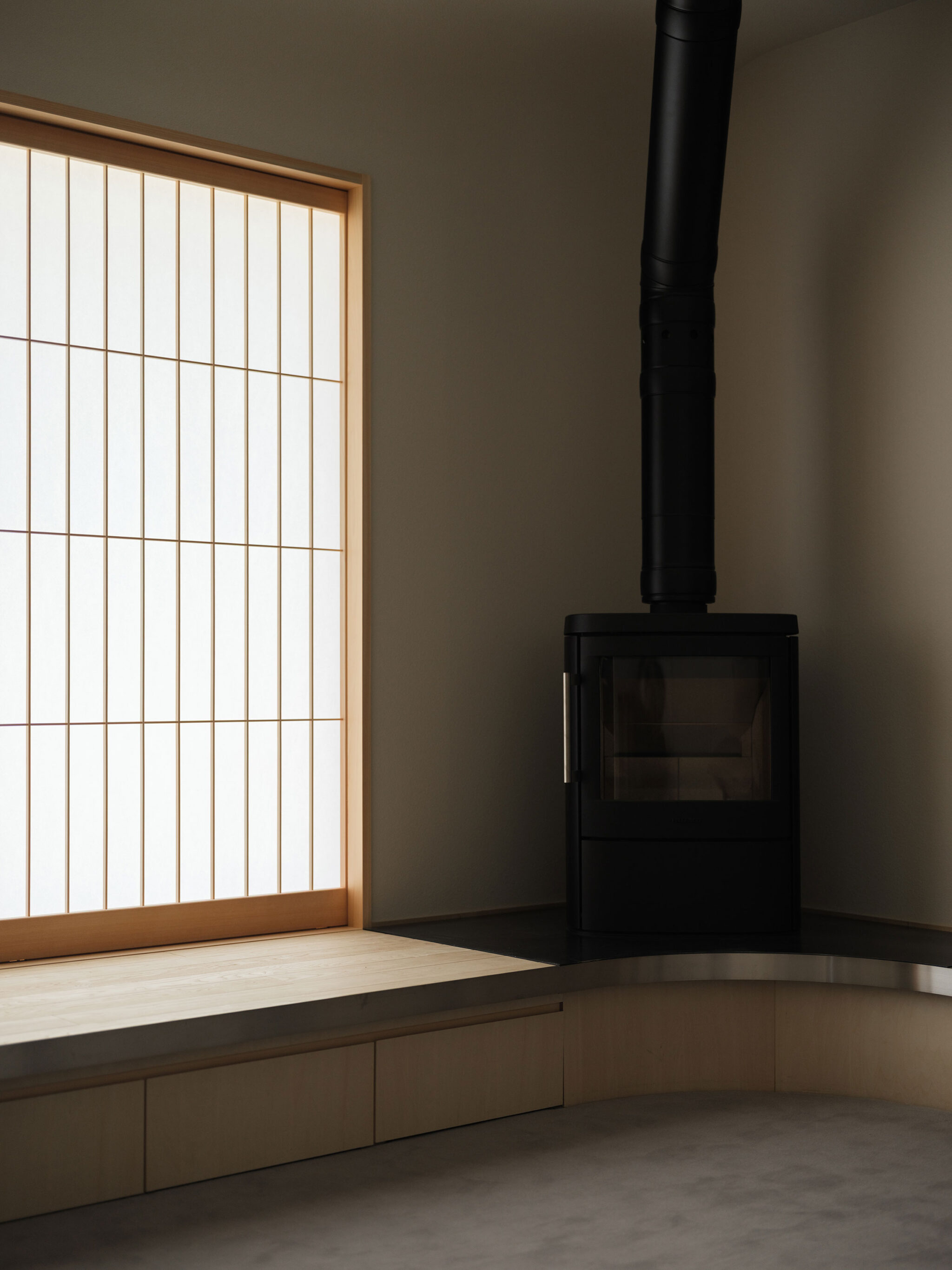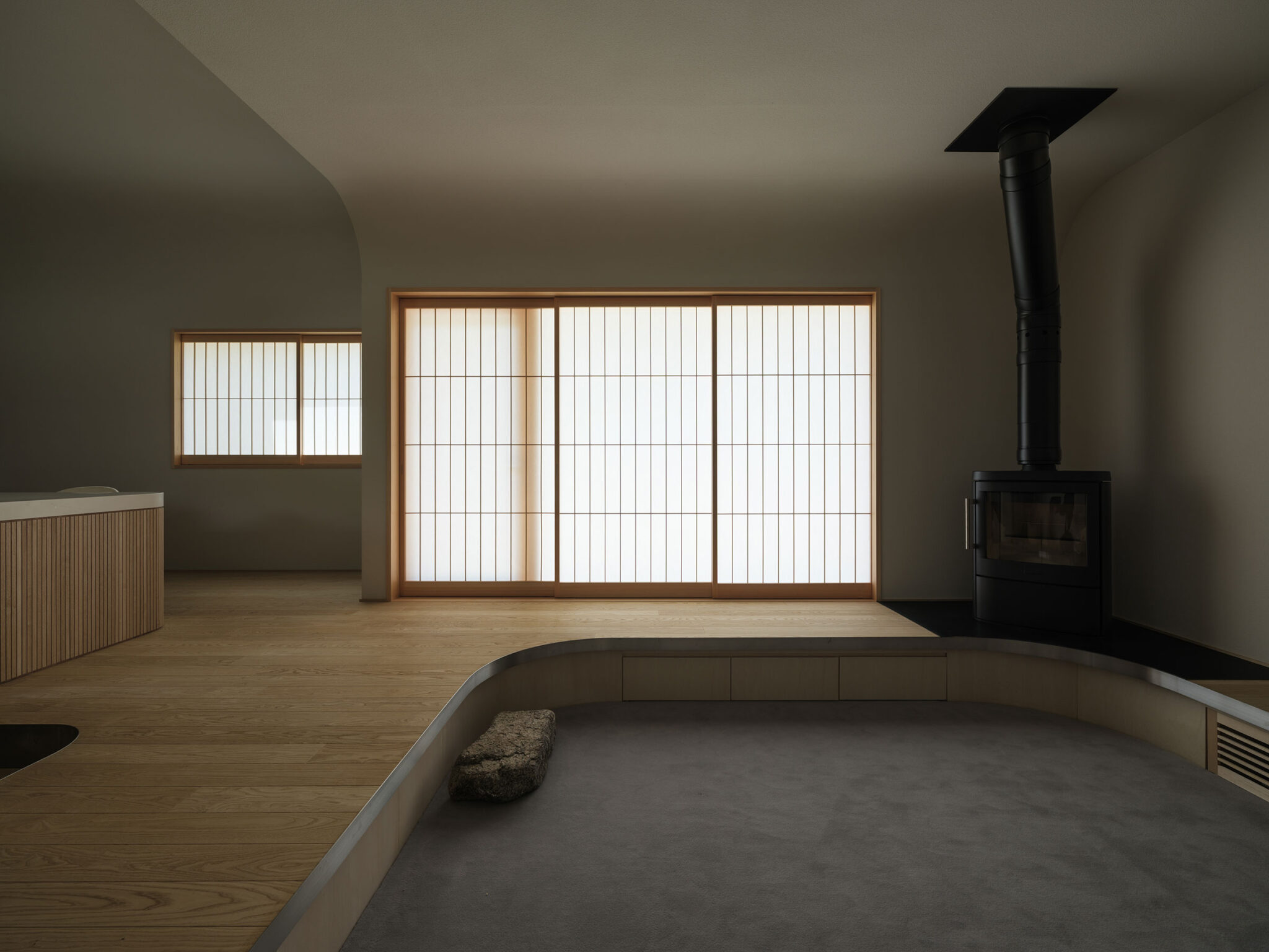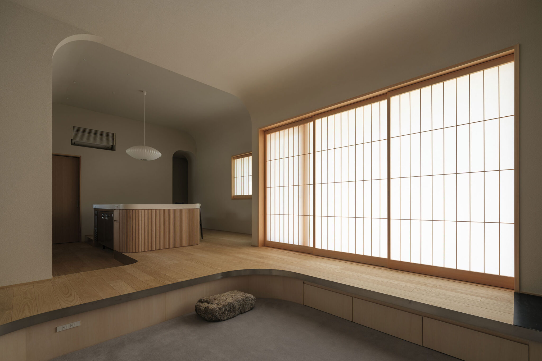藤田時彦 / atelier umiによる、滋賀・高島市の「安曇川の家」。豊かな自然に囲まれた大きな敷地。施主の“森の中に住みたい”という要望を起点とし、“森のような要素”を空間に導入する計画を志向。天井高の変化と“柔らかなアール”の連続で木々の下を歩く様な感覚を生み出すリビング、障子と床の詳細 photo©貝出翔太郎