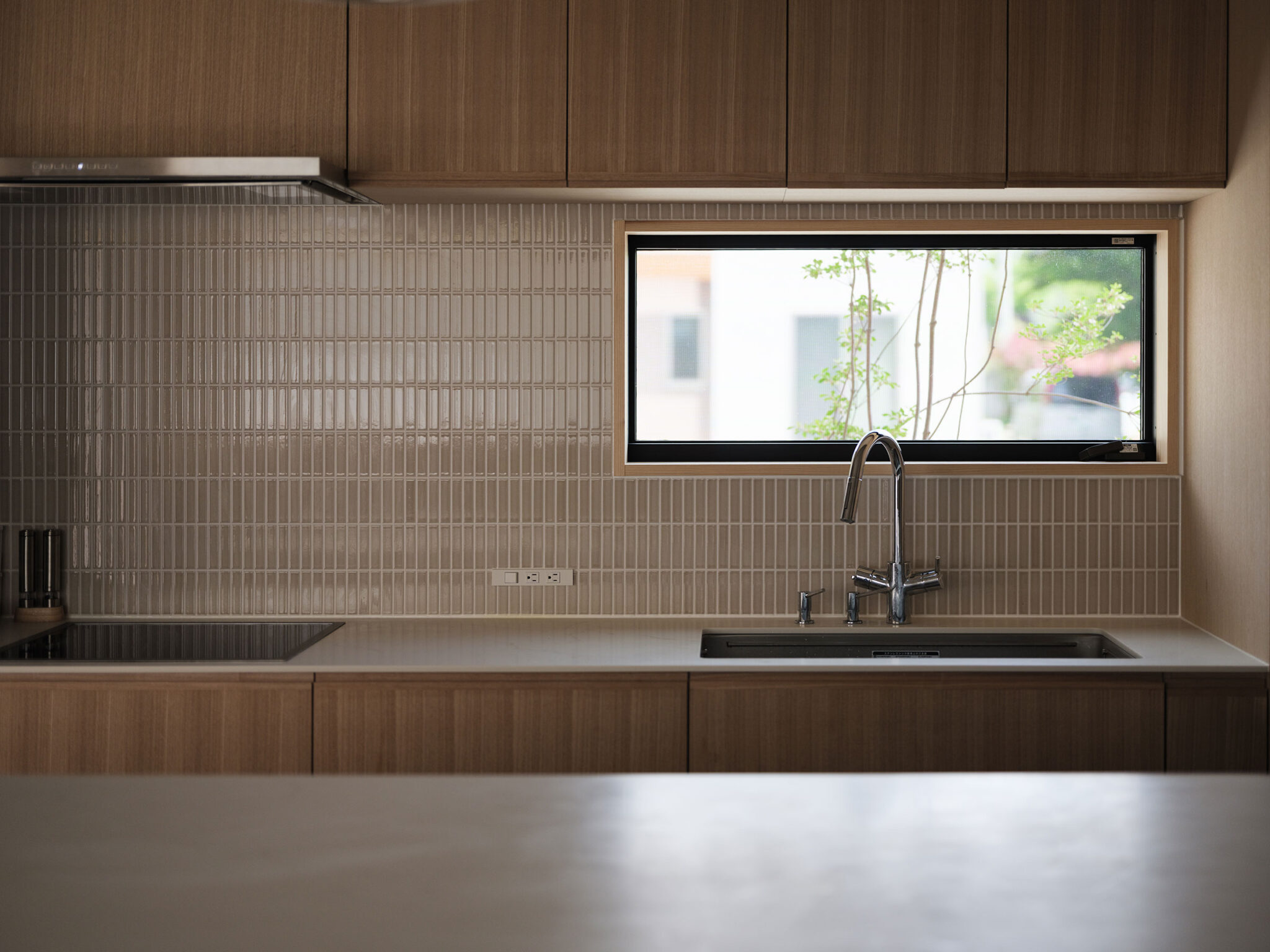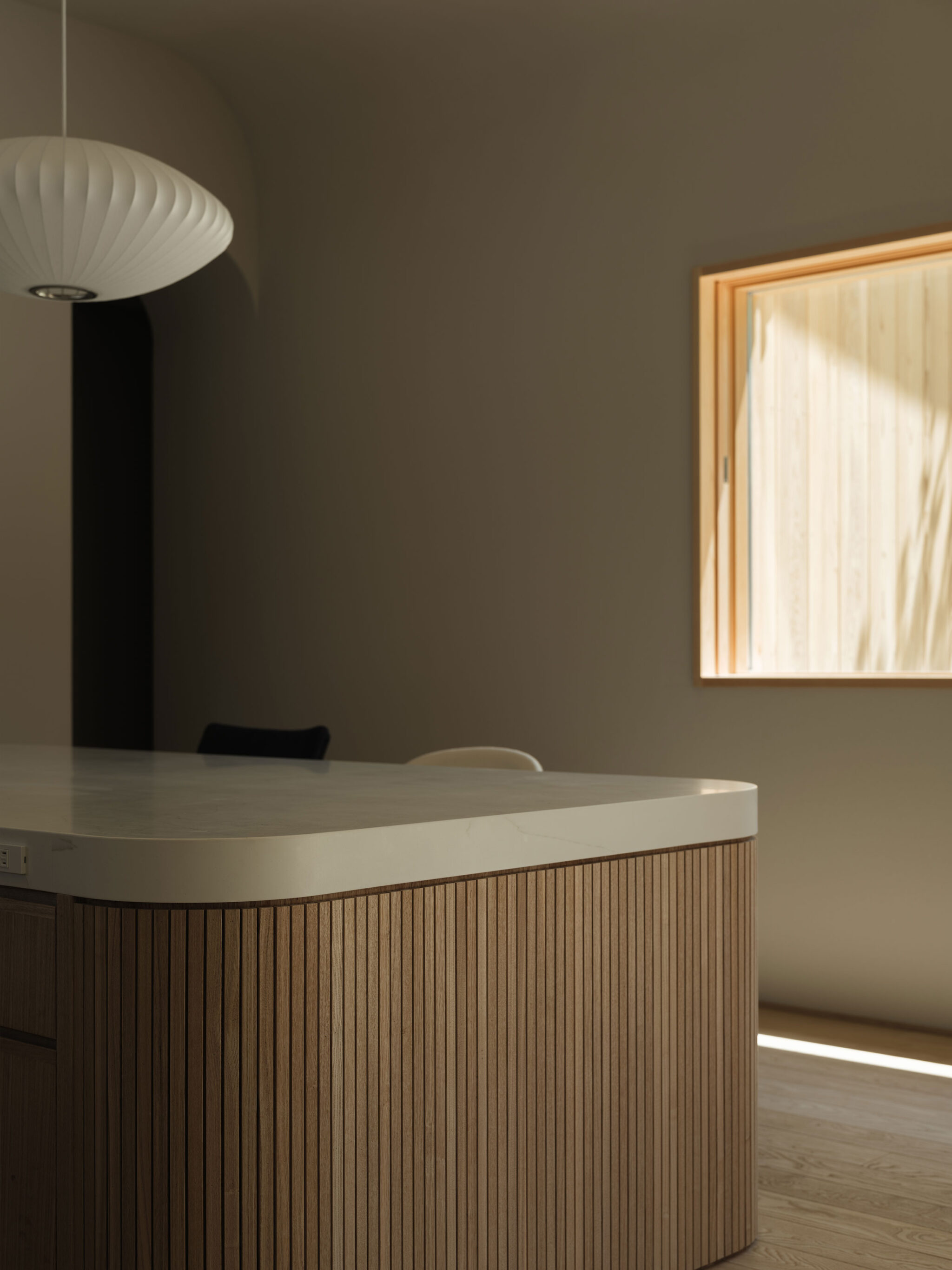 藤田時彦 / atelier umiによる、滋賀・高島市の「安曇川の家」。豊かな自然に囲まれた大きな敷地。施主の“森の中に住みたい”という要望を起点とし、“森のような要素”を空間に導入する計画を志向。天井高の変化と“柔らかなアール”の連続で木々の下を歩く様な感覚を生み出すキッチンとダイニング photo©貝出翔太郎