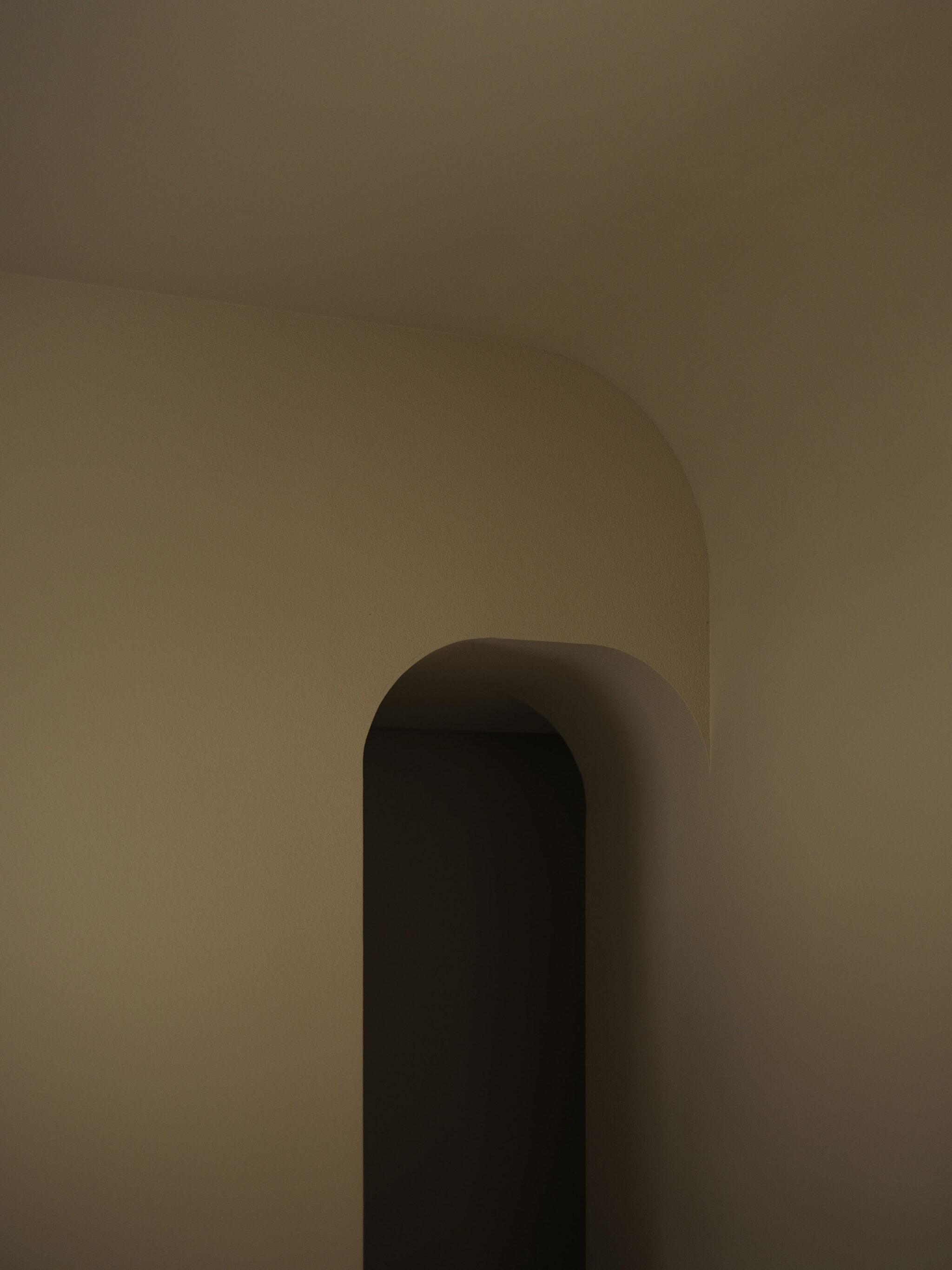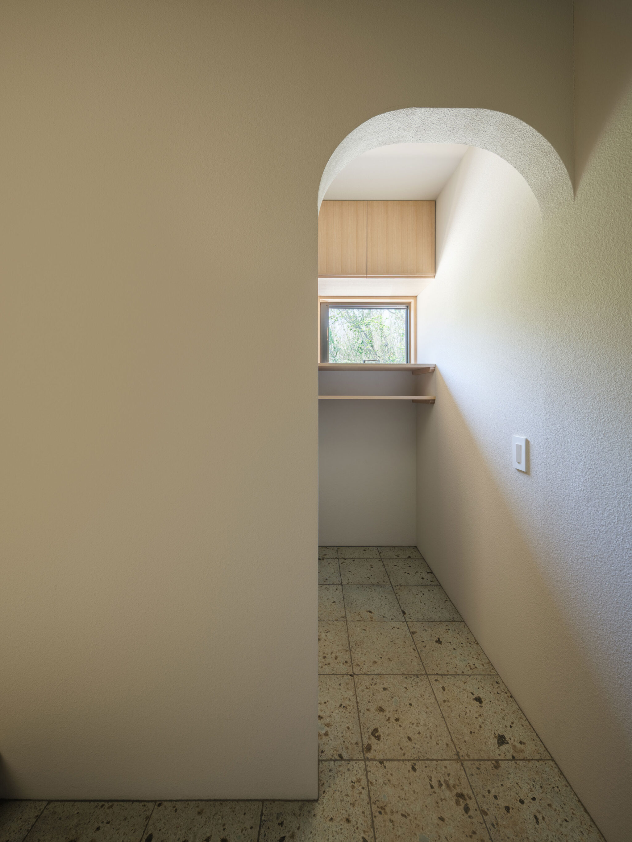 藤田時彦 / atelier umiによる、滋賀・高島市の「安曇川の家」。豊かな自然に囲まれた大きな敷地。施主の“森の中に住みたい”という要望を起点とし、“森のような要素”を空間に導入する計画を志向。天井高の変化と“柔らかなアール”の連続で木々の下を歩く様な感覚を生み出すエントランスからシューズインクローゼット側を見る。 photo©貝出翔太郎
