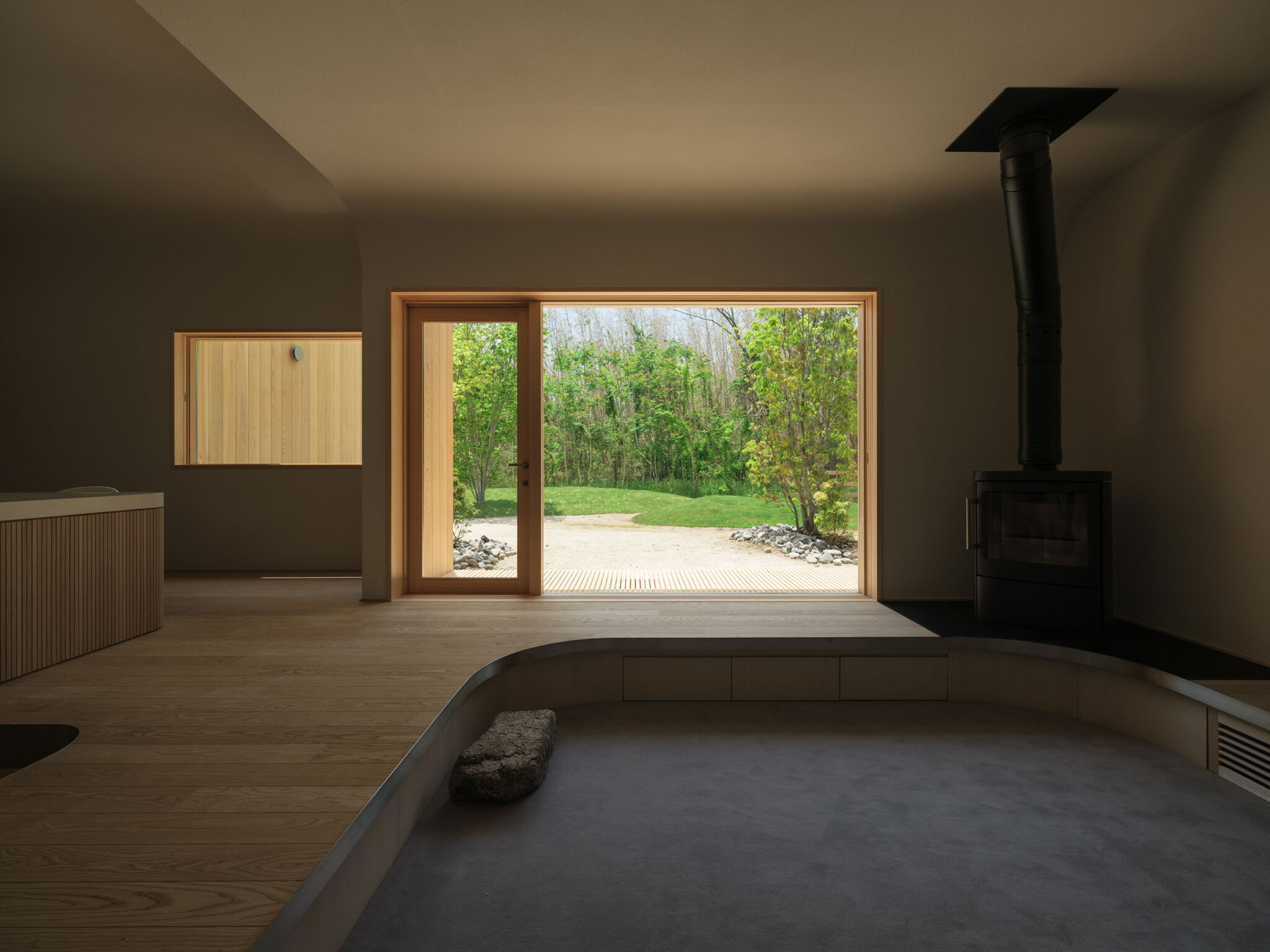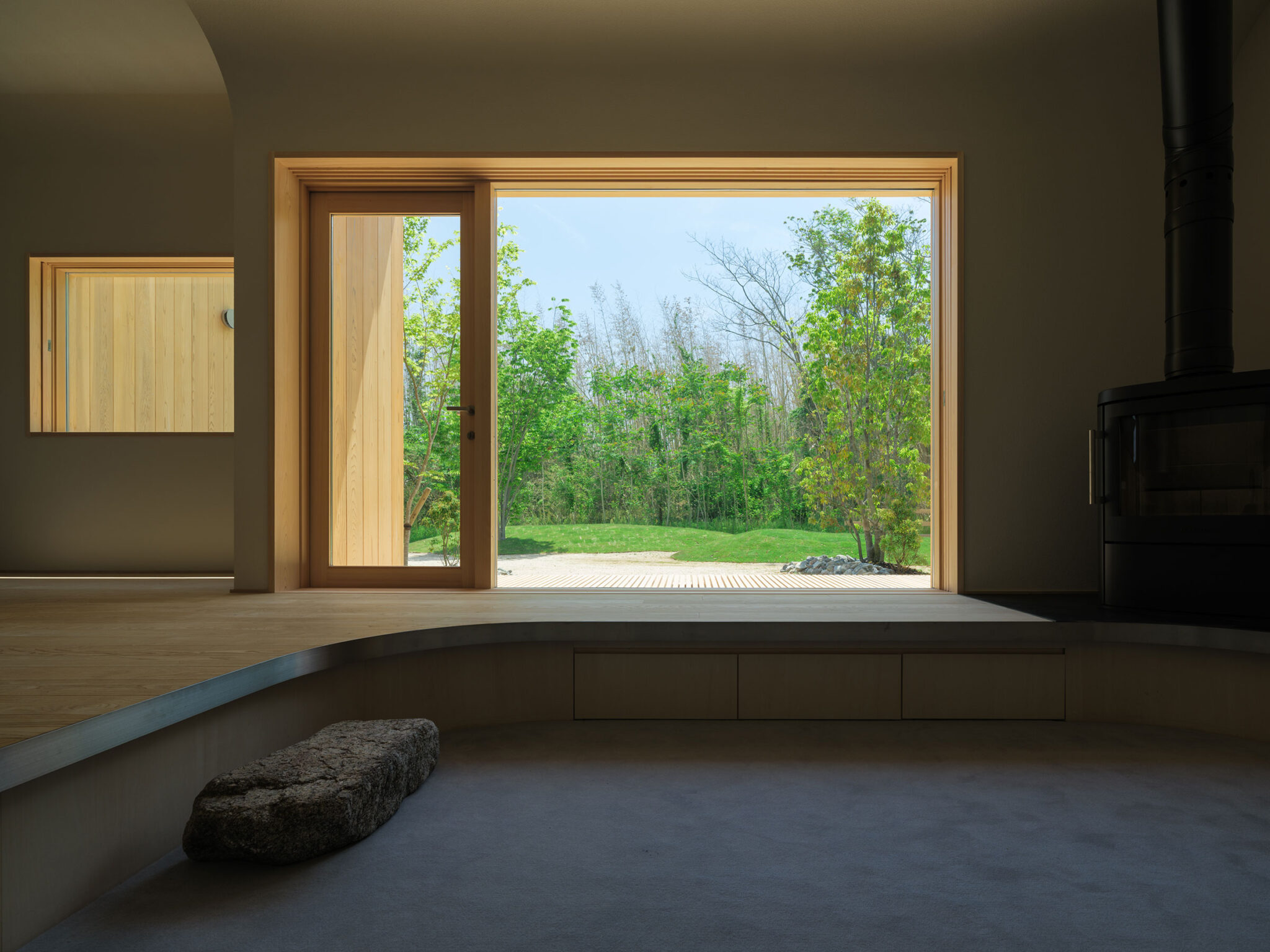 藤田時彦 / atelier umiによる、滋賀・高島市の「安曇川の家」。豊かな自然に囲まれた大きな敷地。施主の“森の中に住みたい”という要望を起点とし、“森のような要素”を空間に導入する計画を志向。天井高の変化と“柔らかなアール”の連続で木々の下を歩く様な感覚を生み出すリビングの開口部越しに外部を見る。 photo©貝出翔太郎