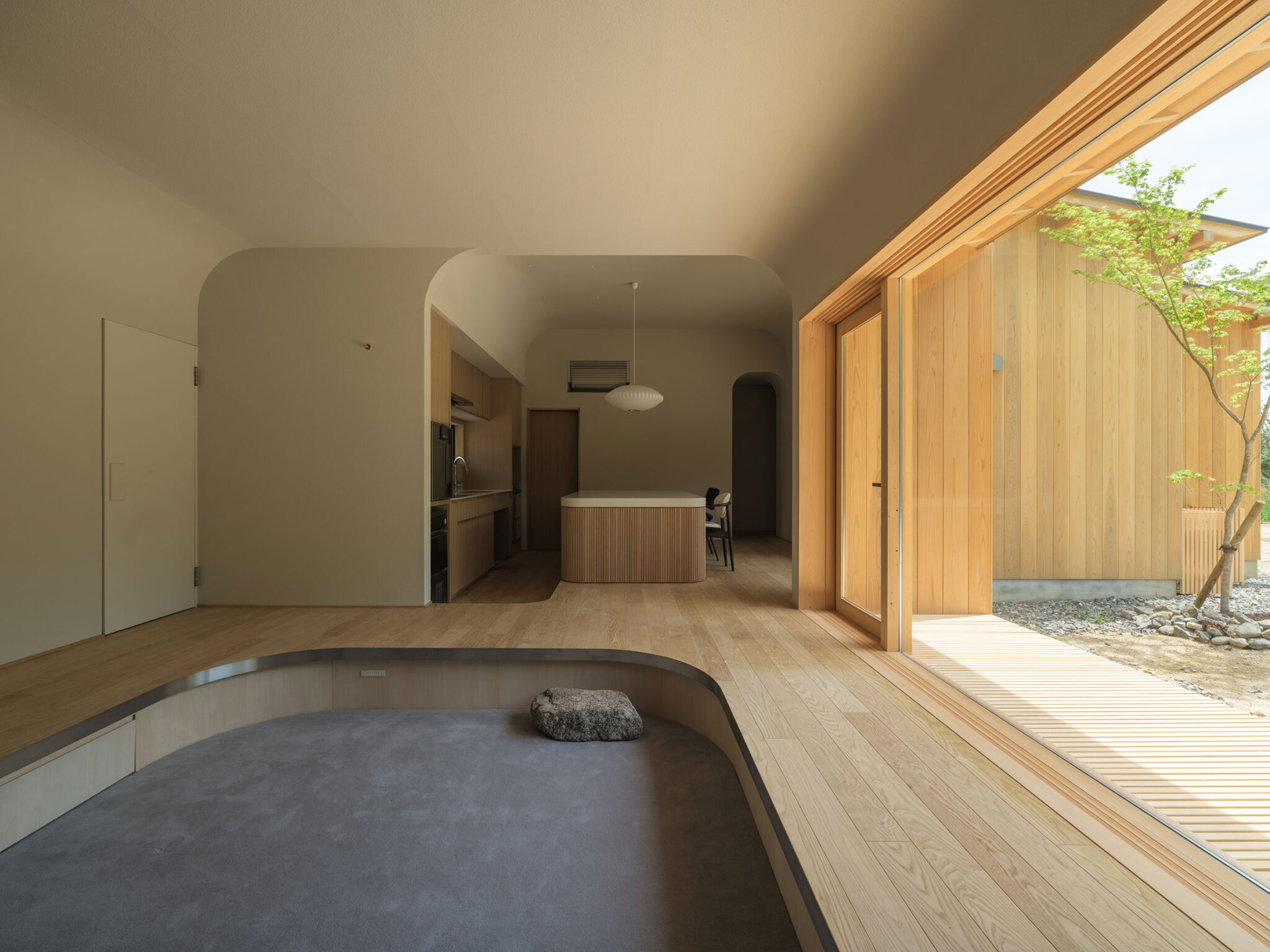 藤田時彦 / atelier umiによる、滋賀・高島市の「安曇川の家」。豊かな自然に囲まれた大きな敷地。施主の“森の中に住みたい”という要望を起点とし、“森のような要素”を空間に導入する計画を志向。天井高の変化と“柔らかなアール”の連続で木々の下を歩く様な感覚を生み出すリビングからキッチンとダイニング側を見る。 photo©貝出翔太郎