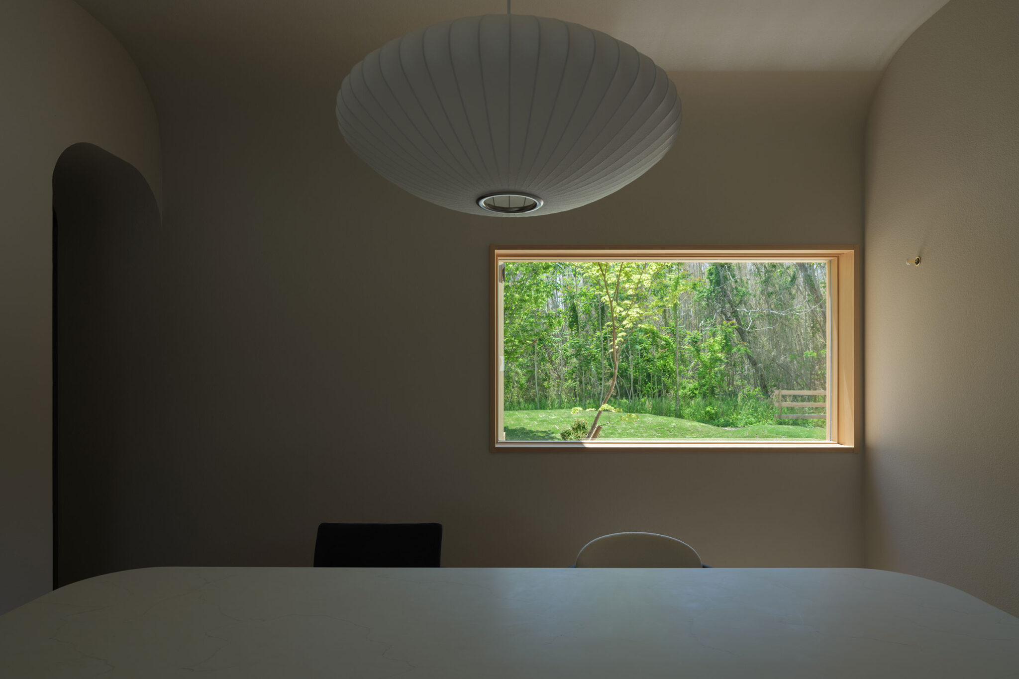 藤田時彦 / atelier umiによる、滋賀・高島市の「安曇川の家」。豊かな自然に囲まれた大きな敷地。施主の“森の中に住みたい”という要望を起点とし、“森のような要素”を空間に導入する計画を志向。天井高の変化と“柔らかなアール”の連続で木々の下を歩く様な感覚を生み出すダイニング、壁とアーチの詳細 photo©貝出翔太郎