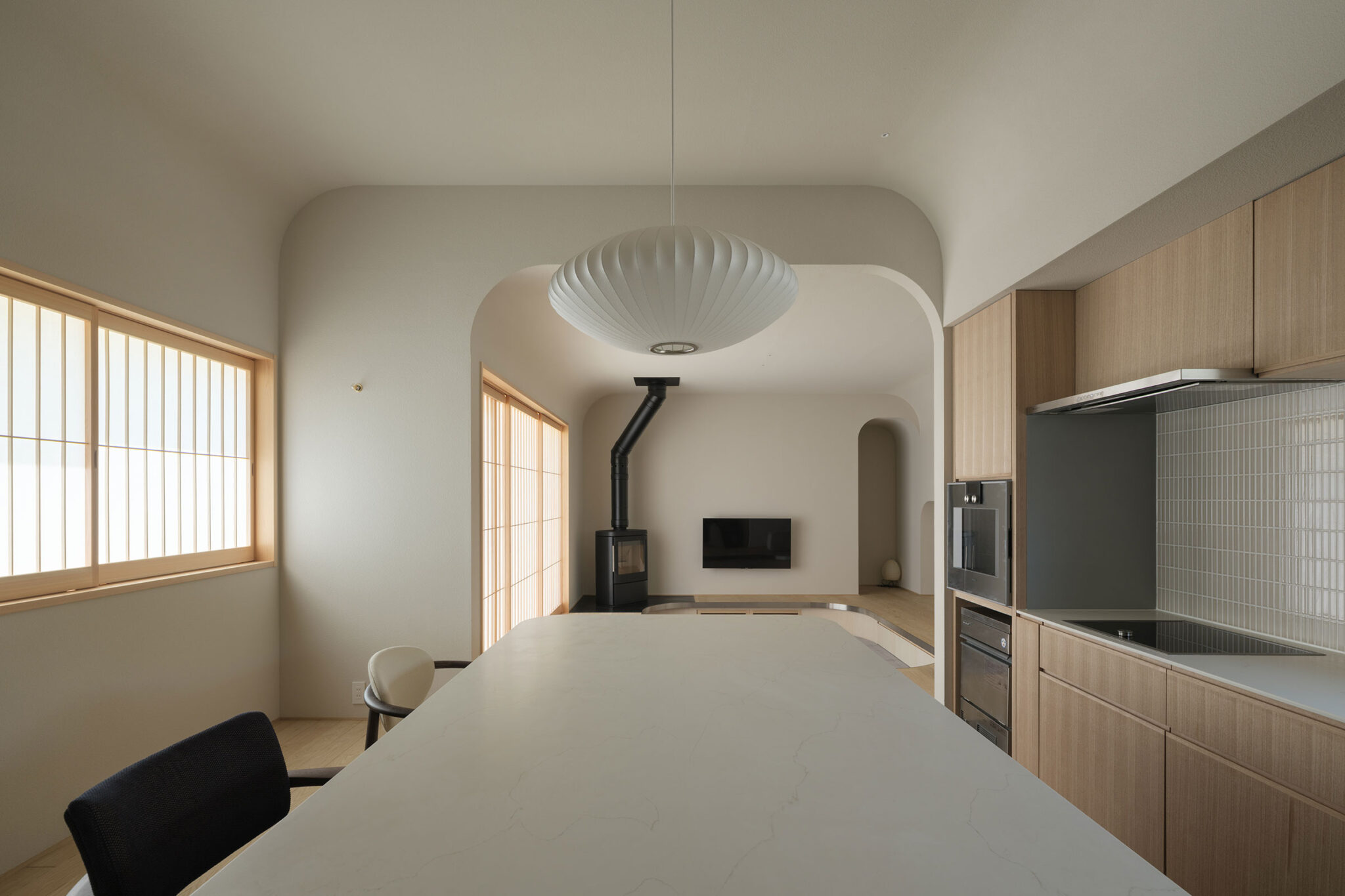 藤田時彦 / atelier umiによる、滋賀・高島市の「安曇川の家」。豊かな自然に囲まれた大きな敷地。施主の“森の中に住みたい”という要望を起点とし、“森のような要素”を空間に導入する計画を志向。天井高の変化と“柔らかなアール”の連続で木々の下を歩く様な感覚を生み出すダイニングからキッチンを見る。 photo©貝出翔太郎