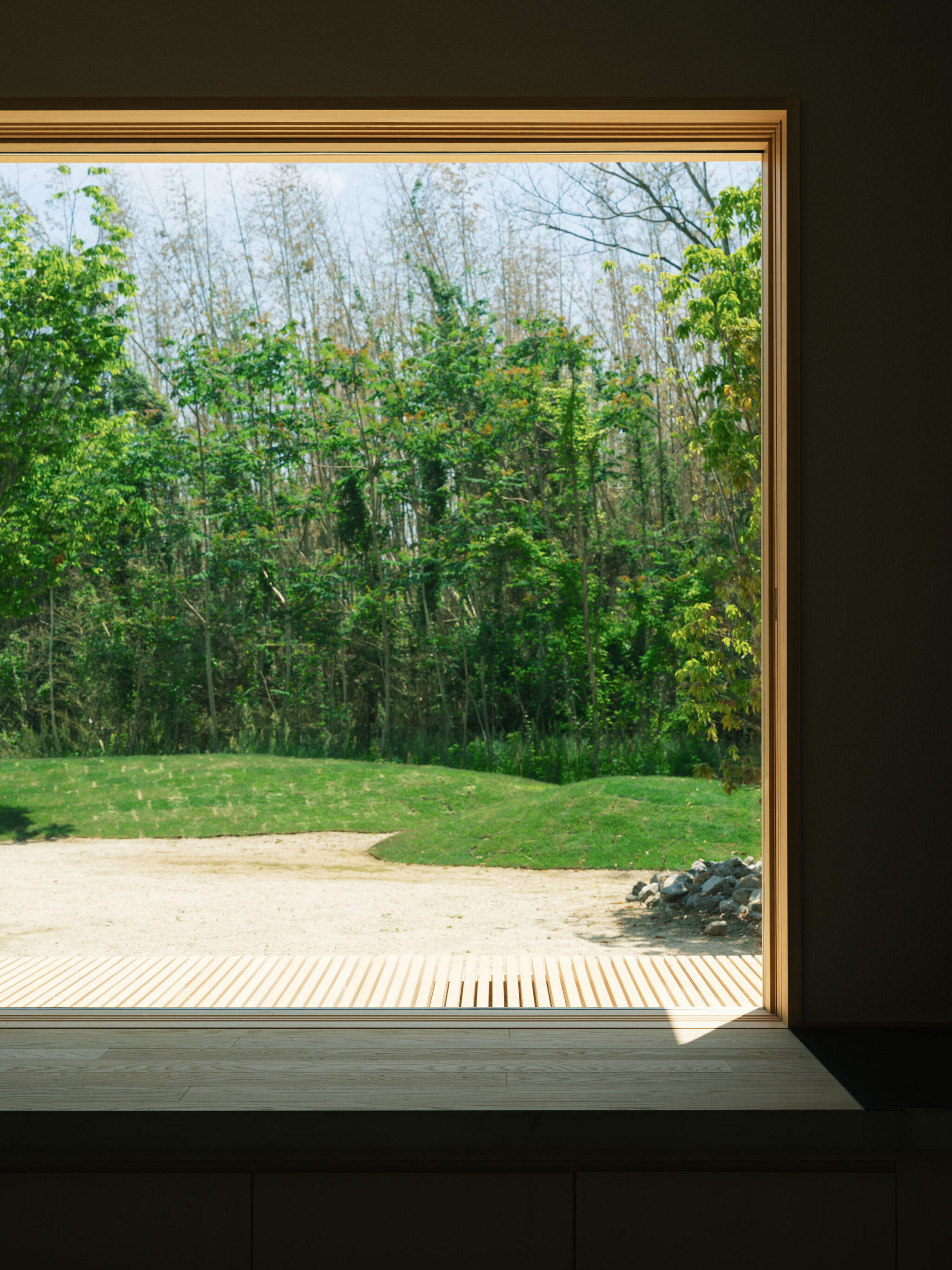 藤田時彦 / atelier umiによる、滋賀・高島市の「安曇川の家」。豊かな自然に囲まれた大きな敷地。施主の“森の中に住みたい”という要望を起点とし、“森のような要素”を空間に導入する計画を志向。天井高の変化と“柔らかなアール”の連続で木々の下を歩く様な感覚を生み出す外構、床の詳細 photo©貝出翔太郎