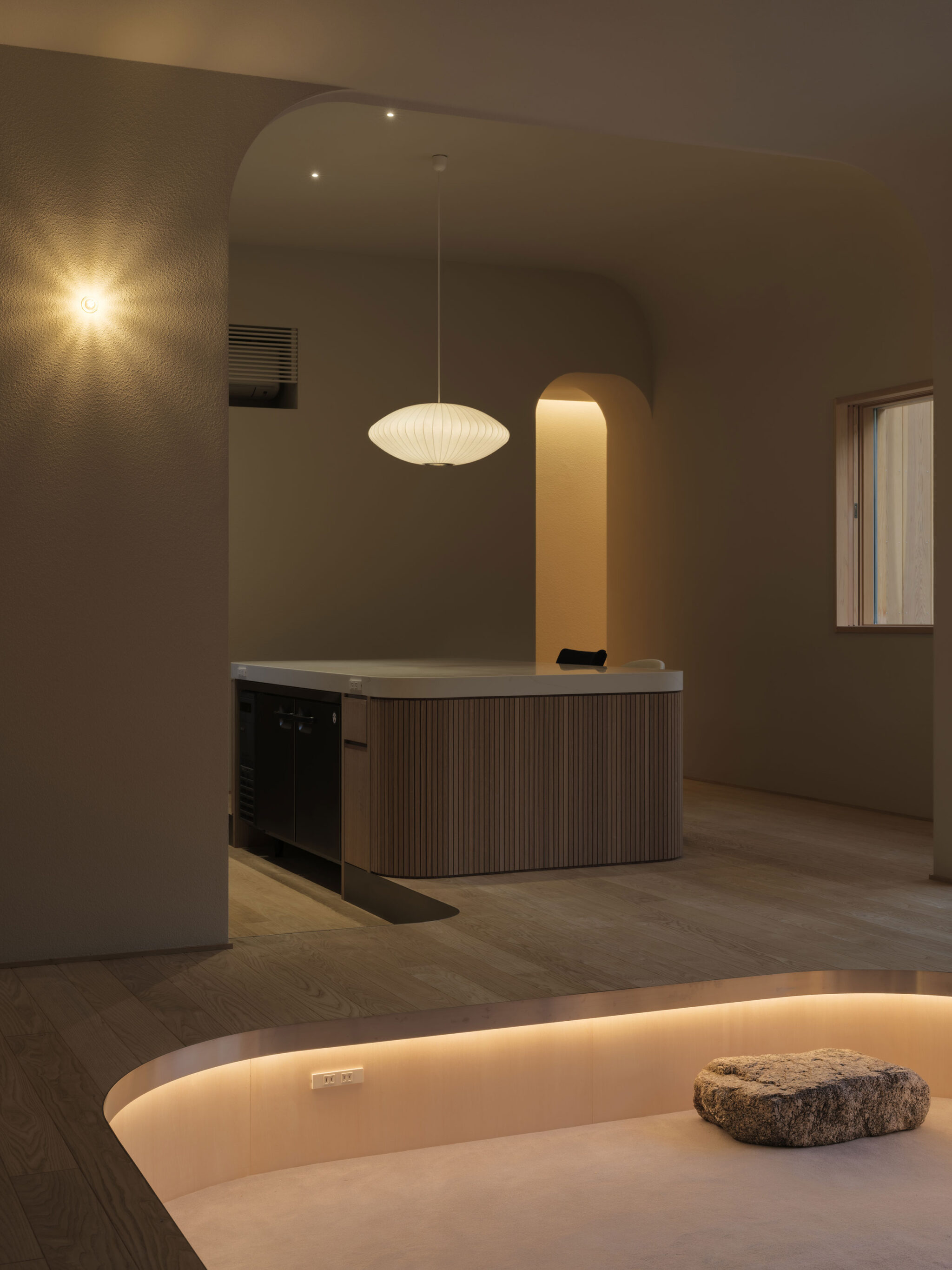 藤田時彦 / atelier umiによる、滋賀・高島市の「安曇川の家」。豊かな自然に囲まれた大きな敷地。施主の“森の中に住みたい”という要望を起点とし、“森のような要素”を空間に導入する計画を志向。天井高の変化と“柔らかなアール”の連続で木々の下を歩く様な感覚を生み出すリビングからダイニング側を見る。夜景 photo©貝出翔太郎
