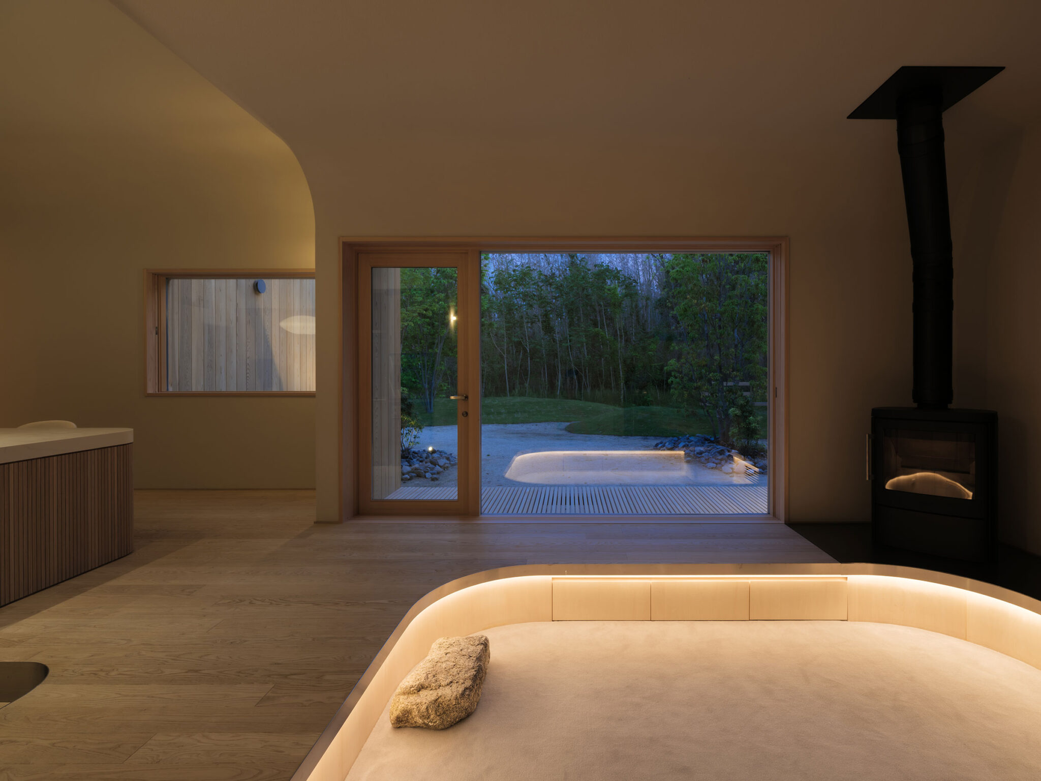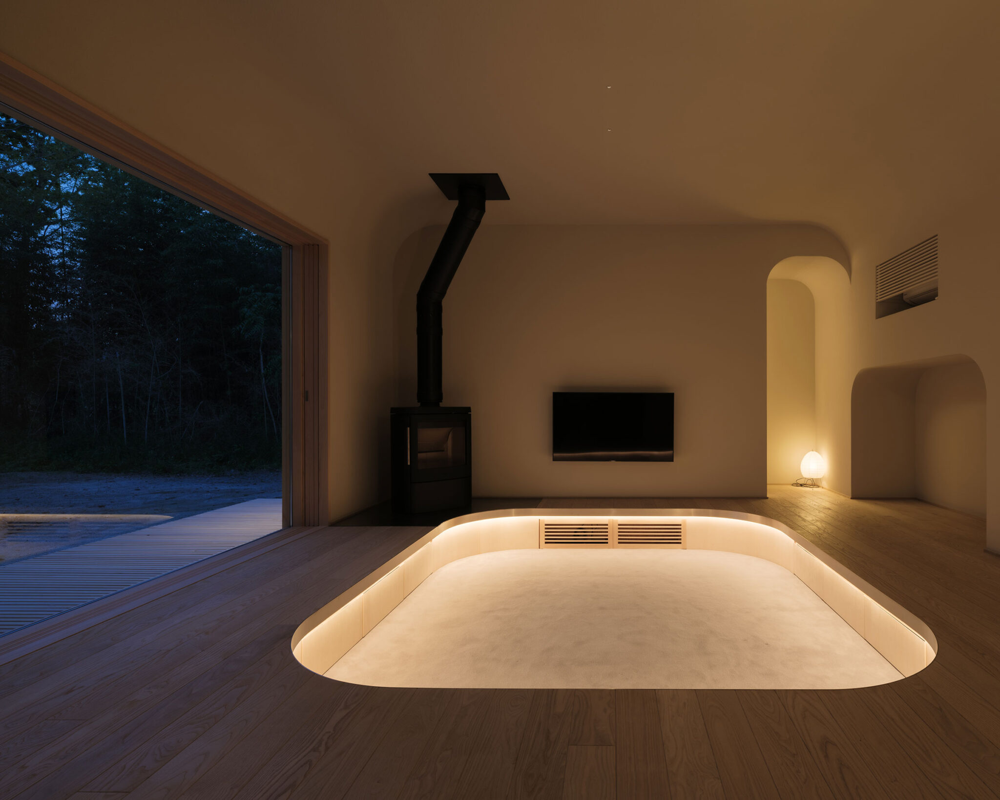 藤田時彦 / atelier umiによる、滋賀・高島市の「安曇川の家」。豊かな自然に囲まれた大きな敷地。施主の“森の中に住みたい”という要望を起点とし、“森のような要素”を空間に導入する計画を志向。天井高の変化と“柔らかなアール”の連続で木々の下を歩く様な感覚を生み出すリビングから開口部越しに外部を見る。夜景 photo©貝出翔太郎
