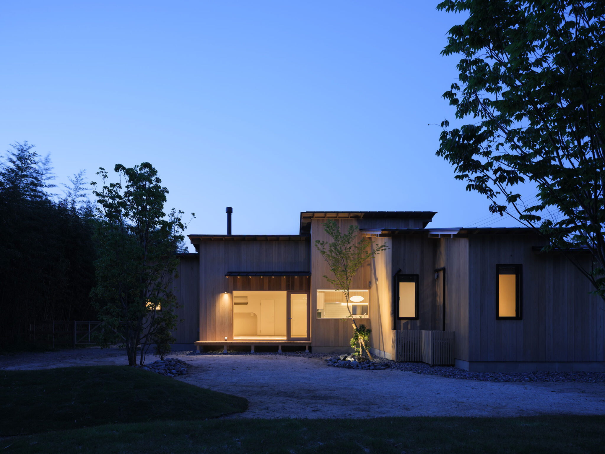 藤田時彦 / atelier umiによる、滋賀・高島市の「安曇川の家」。豊かな自然に囲まれた大きな敷地。施主の“森の中に住みたい”という要望を起点とし、“森のような要素”を空間に導入する計画を志向。天井高の変化と“柔らかなアール”の連続で木々の下を歩く様な感覚を生み出す外観、敷地内の南側より見る。夜景 photo©貝出翔太郎