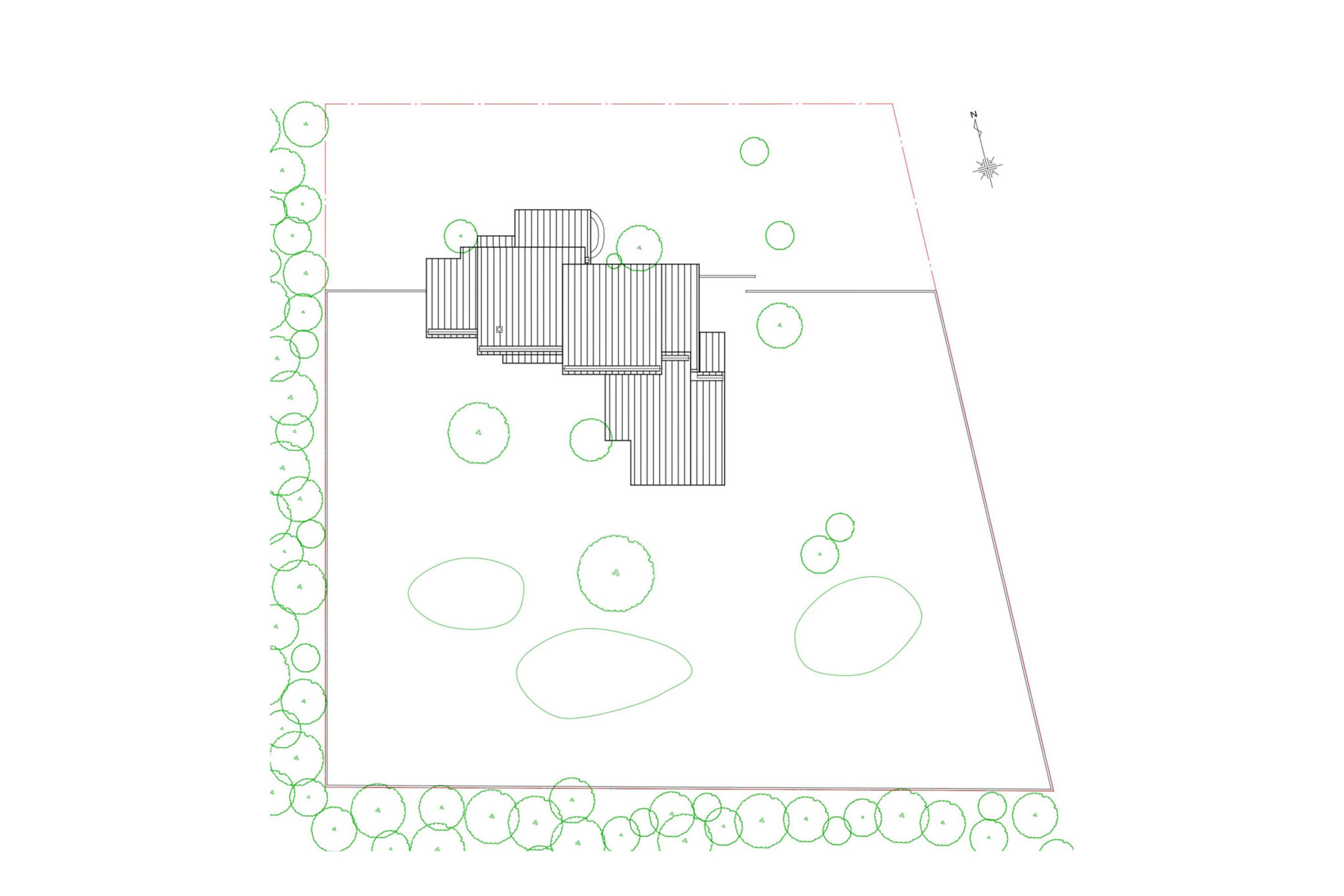 藤田時彦 / atelier umiによる、滋賀・高島市の「安曇川の家」。豊かな自然に囲まれた大きな敷地。施主の“森の中に住みたい”という要望を起点とし、“森のような要素”を空間に導入する計画を志向。天井高の変化と“柔らかなアール”の連続で木々の下を歩く様な感覚を生み出す配置図 image©atelier umi